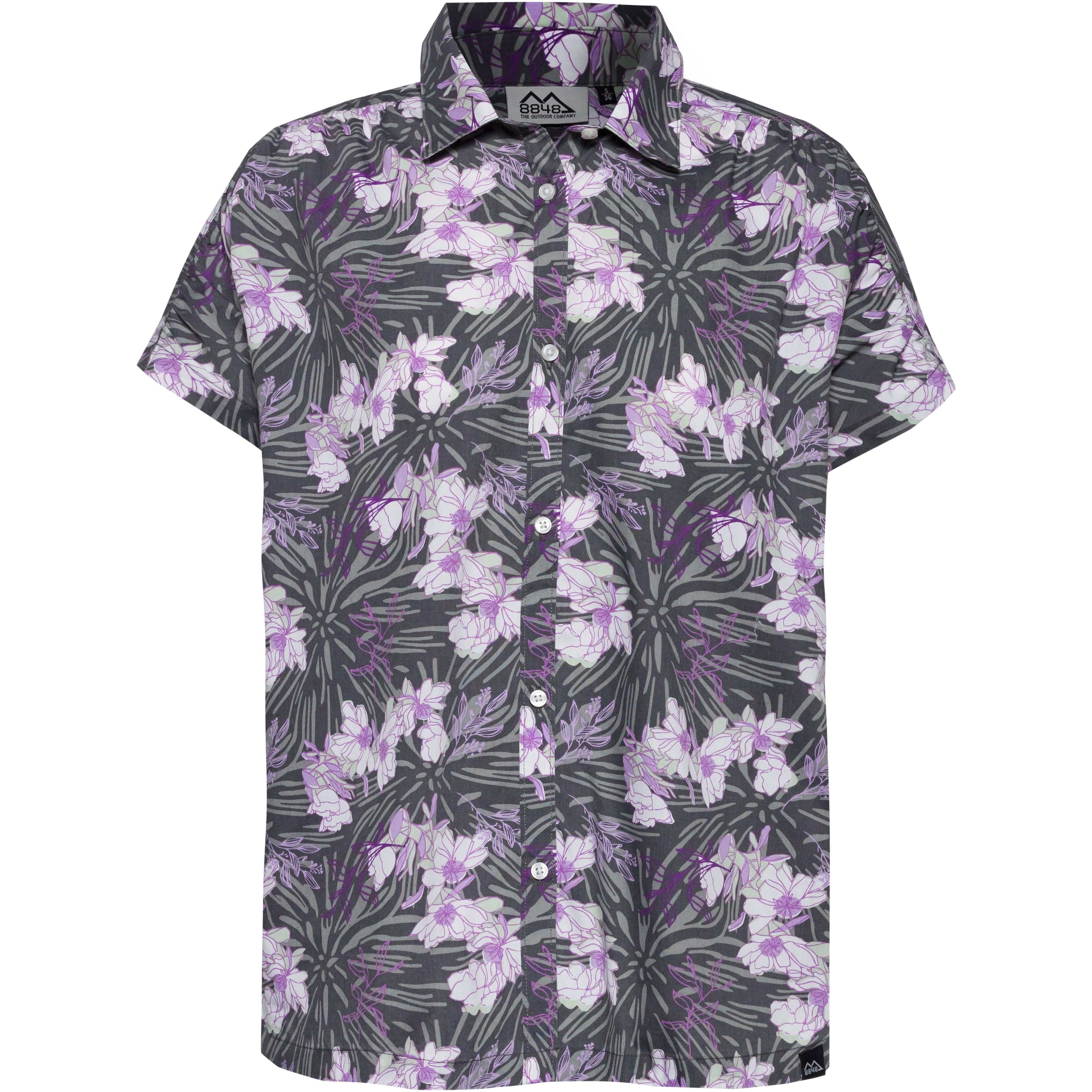 Kurzärmelige Funktionsbluse aus feuchtigkeitsregulierendem Gewebe; klassischer Kragen; durchgehende Knopfleiste; Material 65% Polyester, 35% Baumwolle.