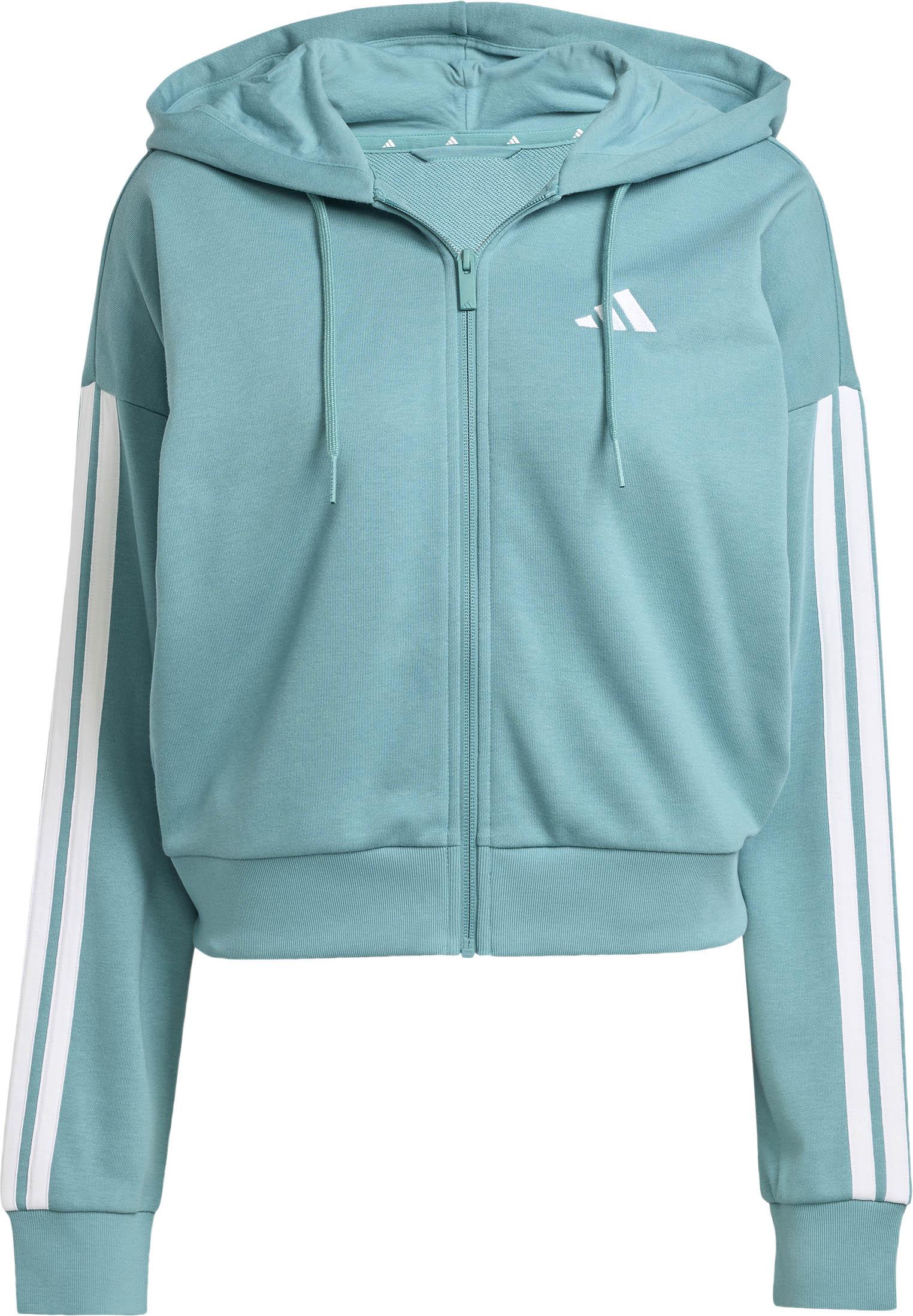 Trainingsjacke aus weichem French-Terry-Material in verkürzter Passform; Kapuze mit Kordelzug; durchgehender, zentraler Reißverschluss; Logodetail auf der Brust und 3-Streifen an den Ärmeln; breite Rippbündchen an Saum und Ärmeln; Material 55% Baumwolle, 36% Polyester (recycelt), 9% Viskose.