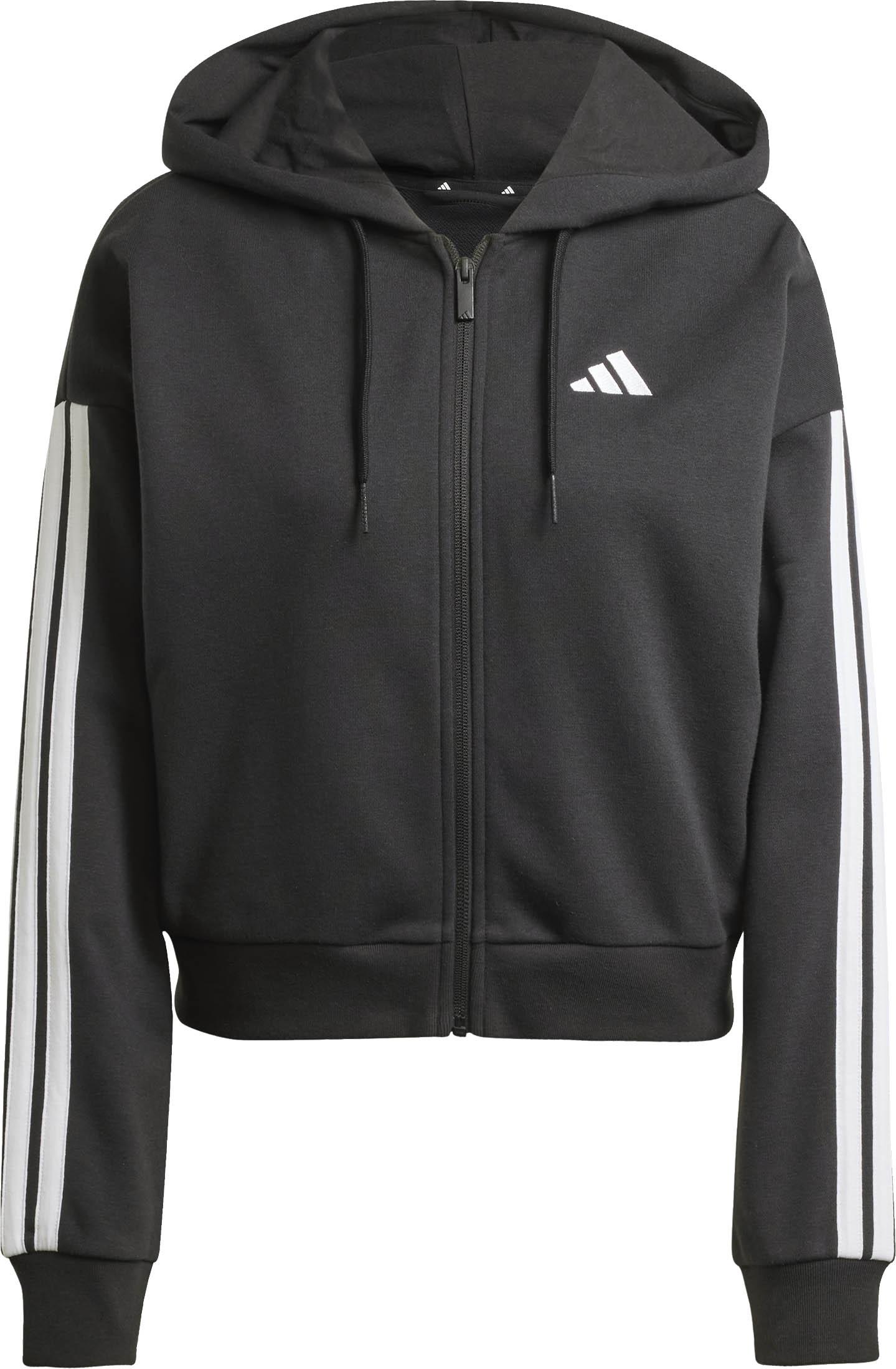 Trainingsjacke aus weichem French-Terry-Material in verkürzter Passform; Kapuze mit Kordelzug; durchgehender, zentraler Reißverschluss; Logodetail auf der Brust und 3-Streifen an den Ärmeln; breite Rippbündchen an Saum und Ärmeln; Material 55% Baumwolle, 36% Polyester (recycelt), 9% Viskose.
