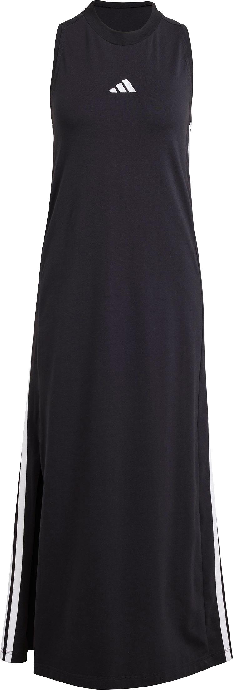 Langes Maxikleid in schlichtem, sportivem Style; aus weichem, elastischem Material; hochgeschlossen mit Rundhalsausschnitt; ärmelloses Ringerrücken-Design; kleines Logo auf der Brust; durchgehende 3-Streifen entlang der Seiten; hoher Beinschlitz auf der rechten Seite; Material 93% Baumwolle, 7% Elastan.