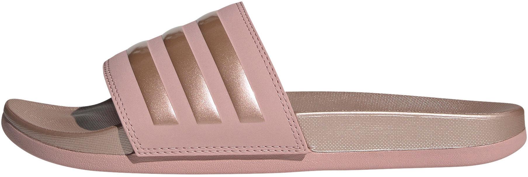 Lässige Badelatschen mit 3-Streifen-Design und Fußbett in Metallic-Optik; vorgeformtes Fußbett; angenehm leichte Dämpfung; rutschfeste Synthetik-Außensohle; reguläre Passform; mit recycelten Materialien gefertigt.