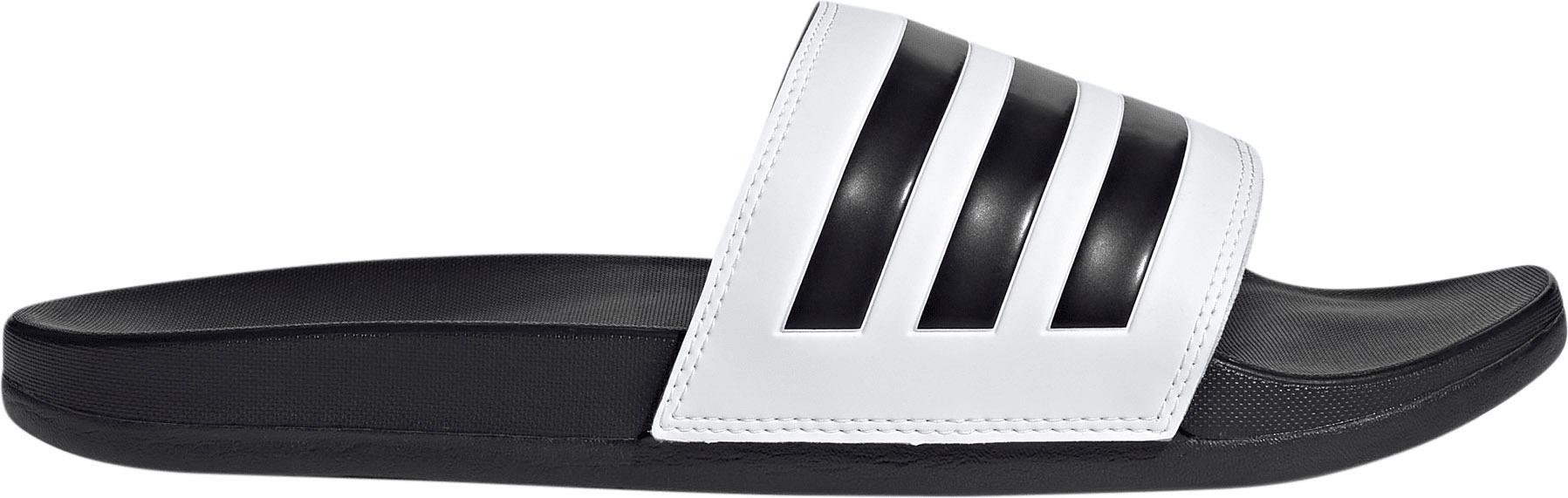 Badelatschen im klassischen Slip-On-Design; breiter Riemen mit 3-Streifen aus Synthetik-Material; Textilfutter; leichte Dämpfung; vorgeformtes Fußbett; EVA-Außensohle.
