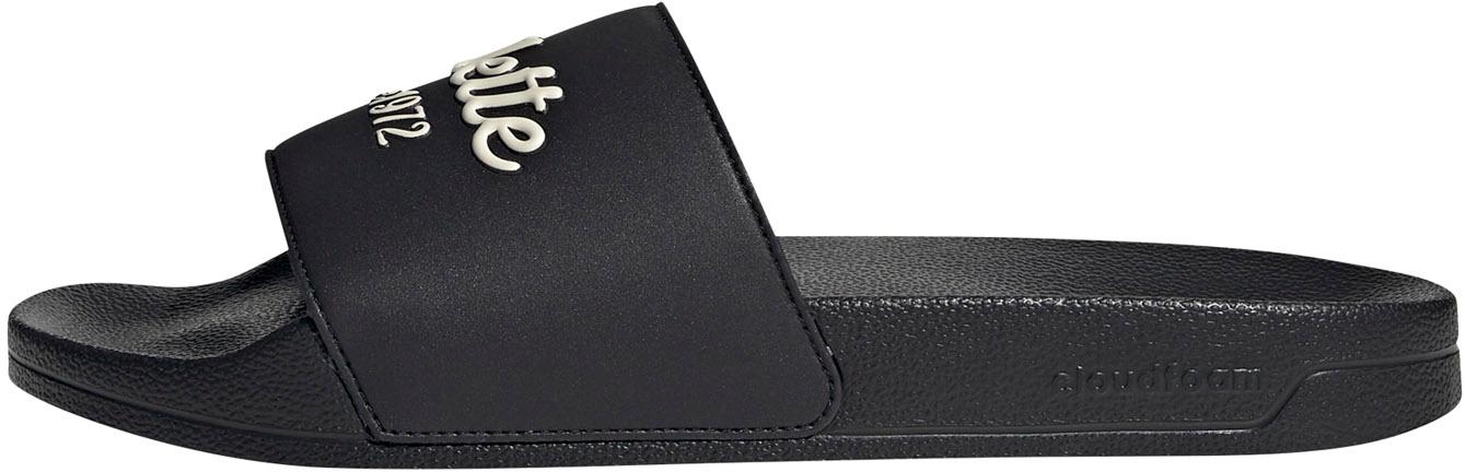 Badelatschen aus Synthetik-Material; breiter Riemen mit „Adilette“-Schriftzug; vorgeformtes Fußbett; leicht profilierte Gummisohle.