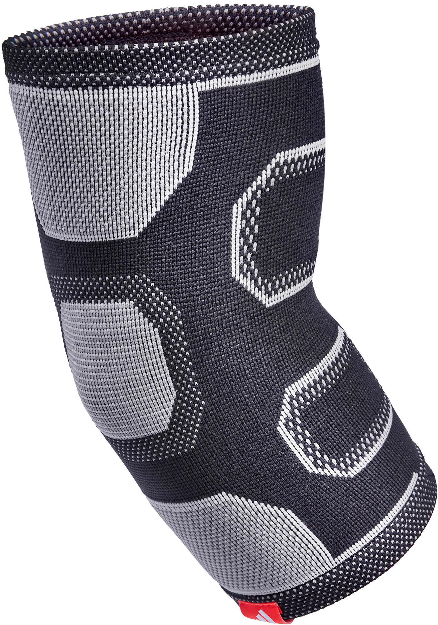 Ergonomisch gestaltete Ellenbogen-Bandage aus atmungsaktivem Strickmaterial; elastisch und stabil, um den Ellenbogen bestmöglich zu unterstützen; passend für einen Ellenbogengelenks-Umfang (bei 45° Beugung) von 22-25 cm; tragbar am linken und rechten Arm; Material Polyamid, Polyester, Elastan.