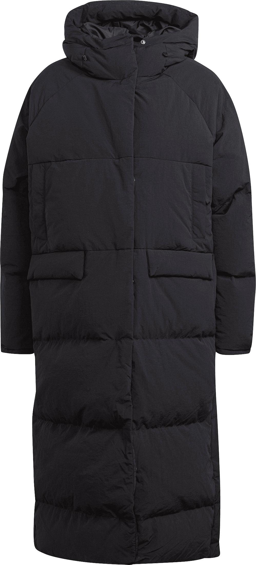 Gesteppter Daunenmantel mit fester, verstellbarer Kapuze und hochabschließendem Kragen; 2-Wege-Frontreißverschluss mit Druckknopfblende; 2 große aufgesetzte Pattentaschen; Seitenschlitze mit Druckknopfleiste; Ärmelabschlüsse mit elastischen Innenbündchen; ohne PFC hergestellte DWR-Beschichtung; Füllung aus Entendaunen; enthält nichttextile Teile tierischen Ursprungs; Primegreen-Produkt; Material 100% Polyester.