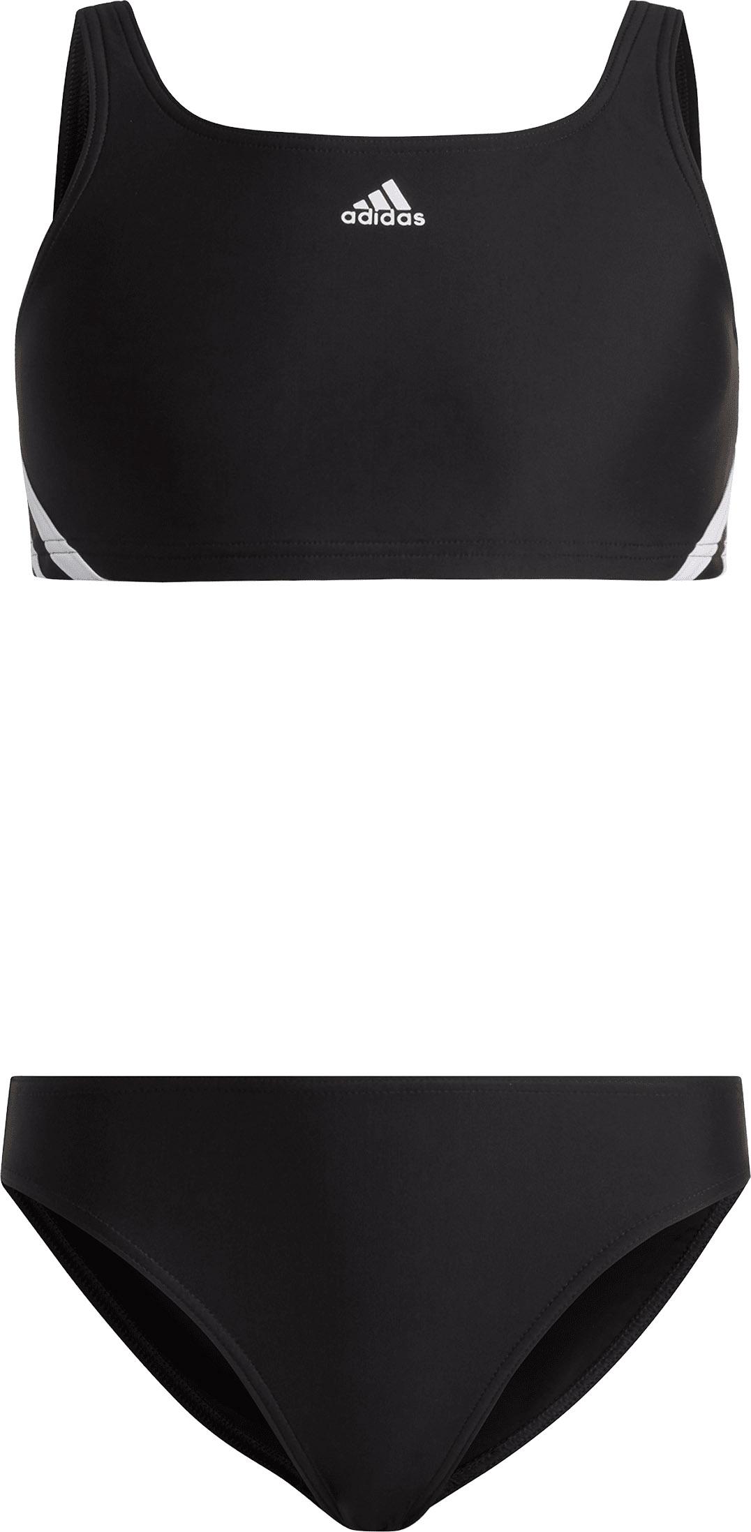 Bikini mit seitlichen 3-Streifen für Mädchen; elastisches Material; Bustier-Oberteil mit Carré-Ausschnitt, Logodetail, normalen Trägern und stylishem Cut-out am Rücken; Slip mit mittlerem Beinausschnitt; mit Recyclingmaterial hergestellt; Material 78% Polyamid (recycelt), 22% Elastan.