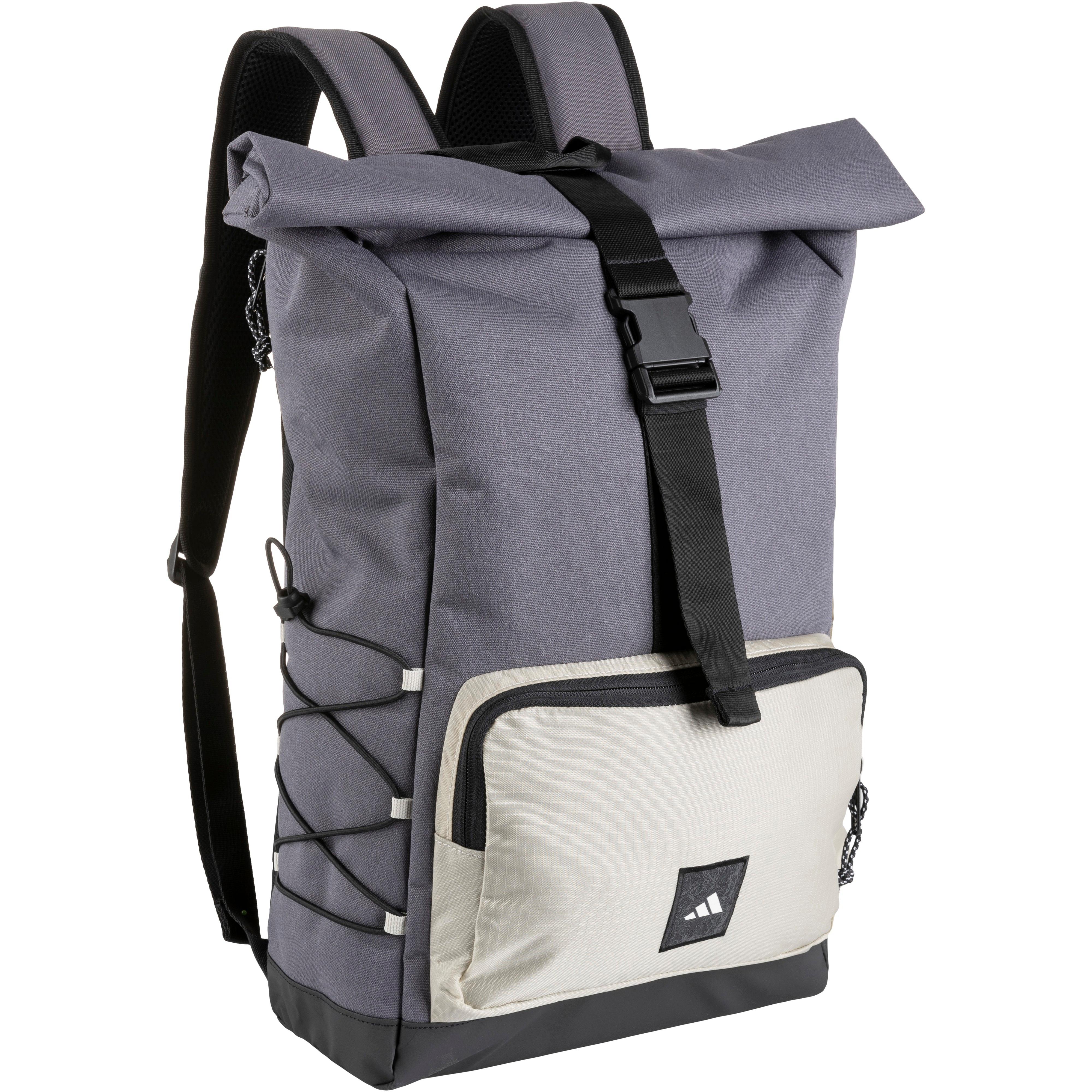 Daypack mit Höhen verstellbarem Rolltop-Verschluss; strapazierfähiges Material mit wasserabweisender Imprägnierung; geräumiges Hauptfach mit Reißverschluss; 1 Fronttasche mit Reißverschluss sowie 1 Seitentasche aus Ripstop-Gewebe; elastische Befestigung an der Seite mit Stopper, ideal für Flaschen, Jacken oder anderen Gegenständen; 1 Rückentasche mit seitlichem Zugriff; gepolsterter Kontaktrücken; Brustgurt; Maße: ca. 13,5 x 28 x 61 cm; Volumen: ca. 24 Liter; aus mindestens 50% recycltem Material.