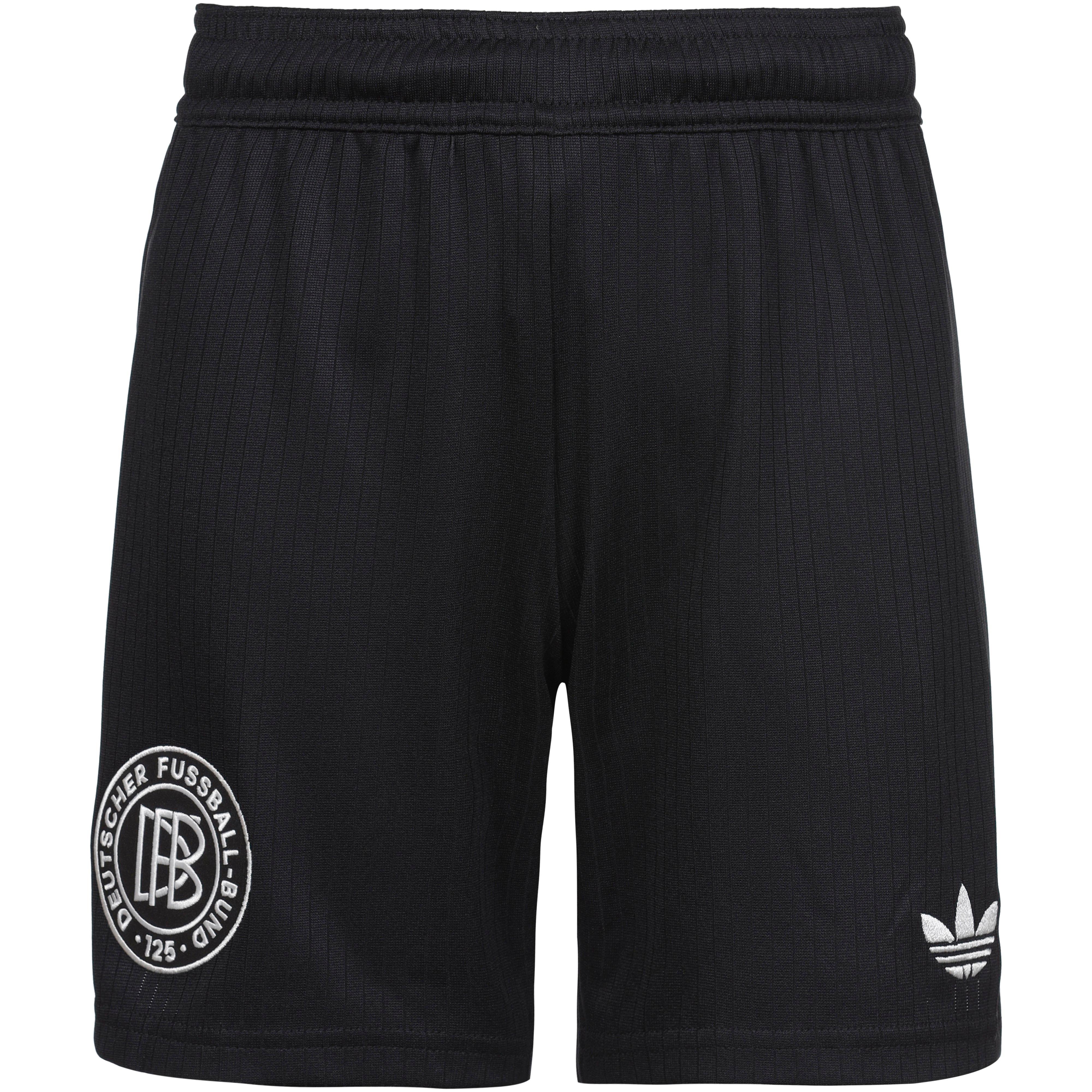 Fußballshorts im offiziellen Design zum 125-jährigen Jubiläum des DFB; weiches Gewebe mit Streifenstruktur; atmungsaktiv, feuchtigkeitsregulierend und schnelltrocknend dank AERO.RDY-Technologie; mittelhoher Gummibund mit Kordelzug innen; Logos an den Beinen; Material 100% Polyester (recycelt).