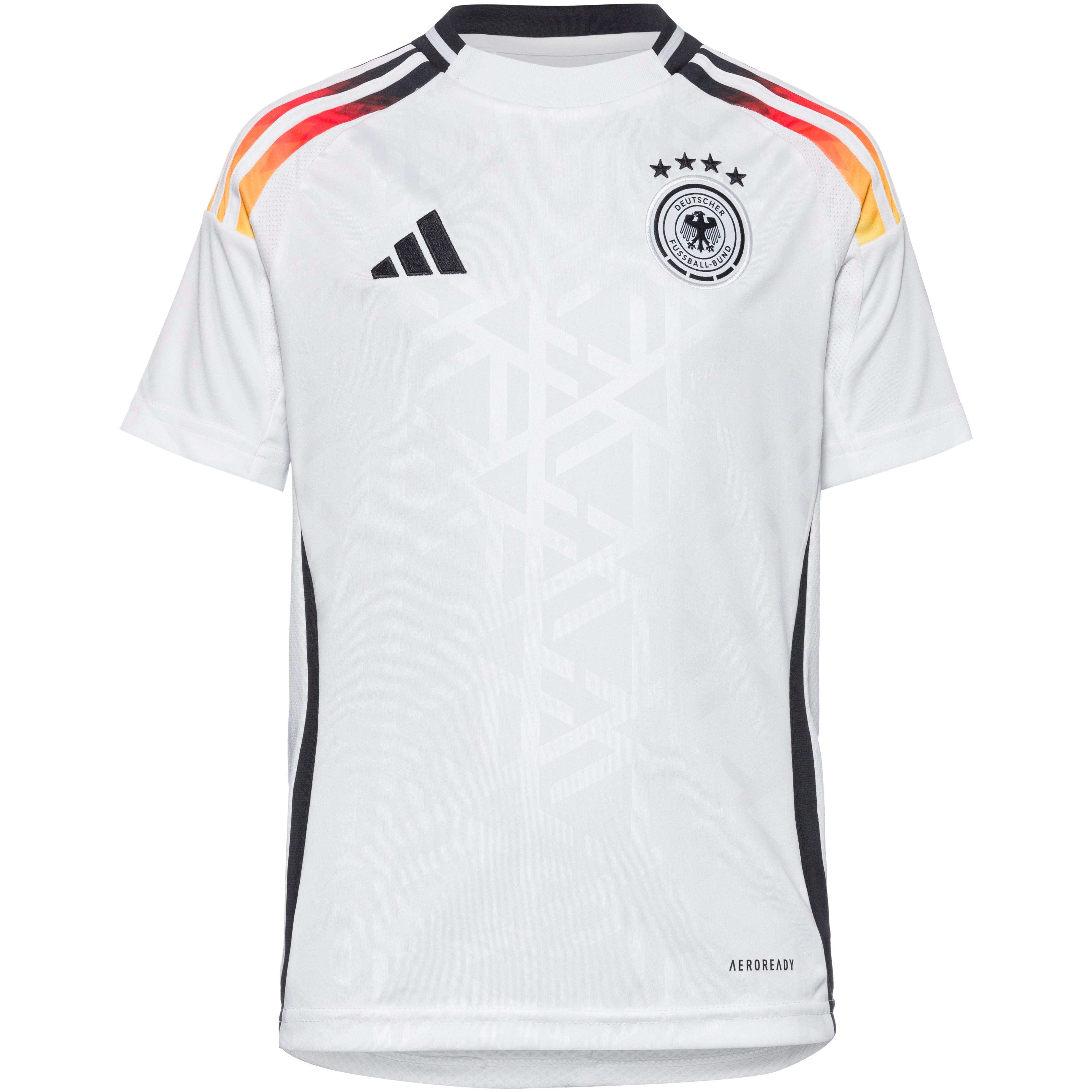 Fußballtrikot für Kinder, der deutschen Nationalmannschaft für die EM 2024; mit feuchtigkeitsregulierender, atmungsaktiver und schnelltrocknender AERO.RDY-Technologie; Rundhalsausschnitt; die Raglanärmel sorgen für optimale Bewegungsfreiheit; die strategisch platzierten Mesh-Einsätze sorgen für angenehme Ventilation; Material 100% Polyester (recycelt).