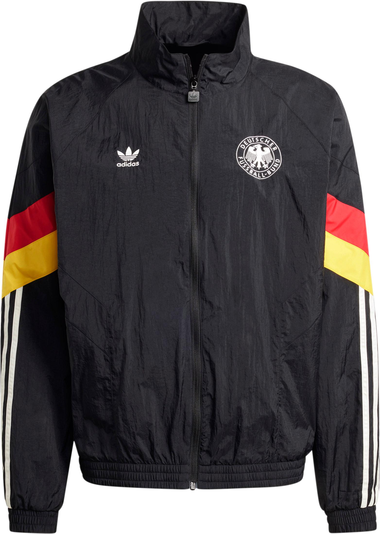 Trainingsjacke im Retro-Design mit DFB-Logo und Markenprint; durchgehender Reißverschluss und Stehkragen; 3-Streifen-Design; elastische Abschlüsse an den Ärmeln und am Saum; Material 100% Polyamid.