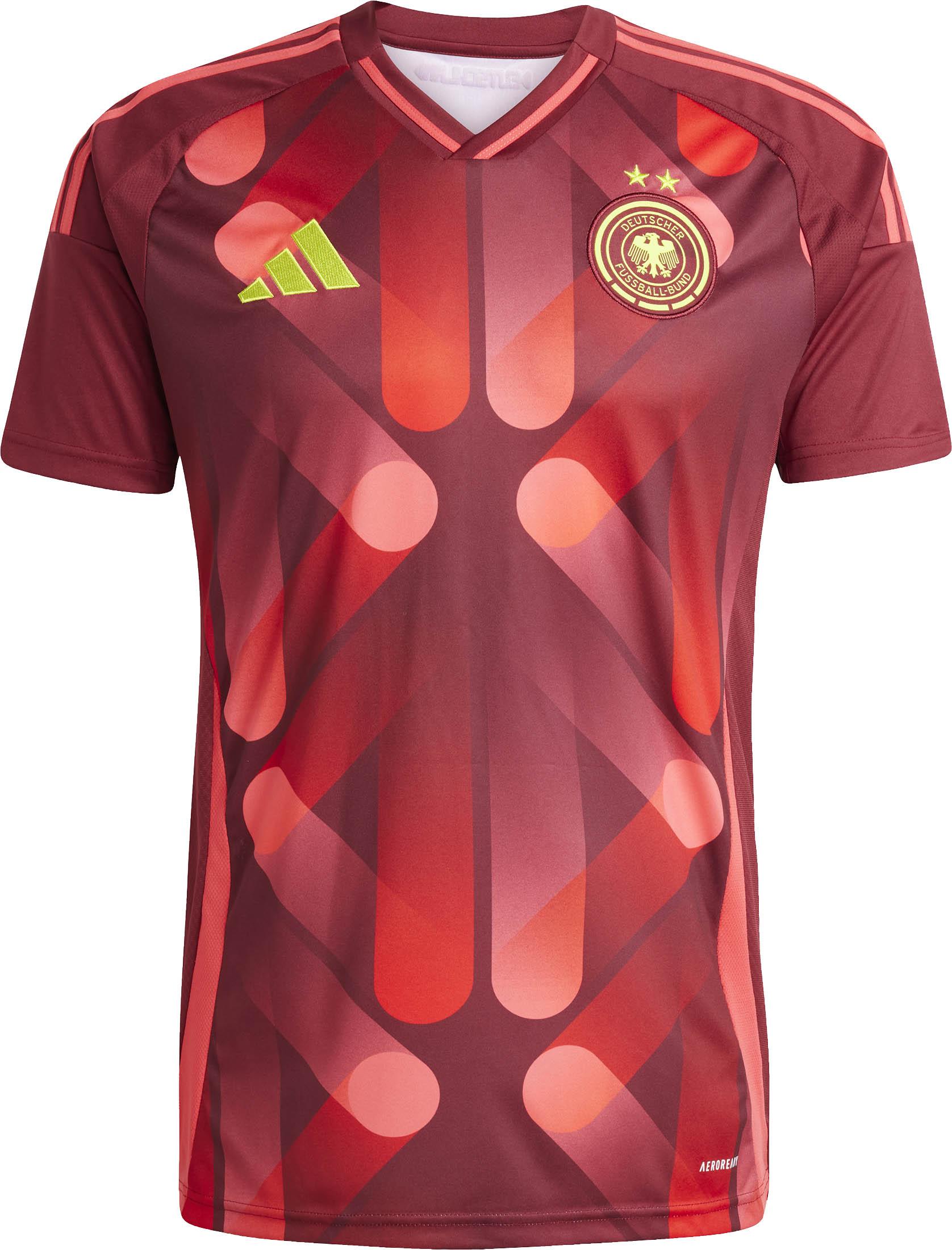 Auswärtstrikot der deutschen Frauen-Nationalelf zur EM 2025; weiches Interlock-Material mit feuchtigkeitsableitender und schnelltrocknender AERO.RDY-Technologie; atmungsaktiv und strapazierfähig; von Streetart inspiriertes Design in Spray-Optik; V-Ausschnitt; Logos auf der Brust; mit belüftenden Mesh-Einsätzen; Material 100% Polyester (recycelt).