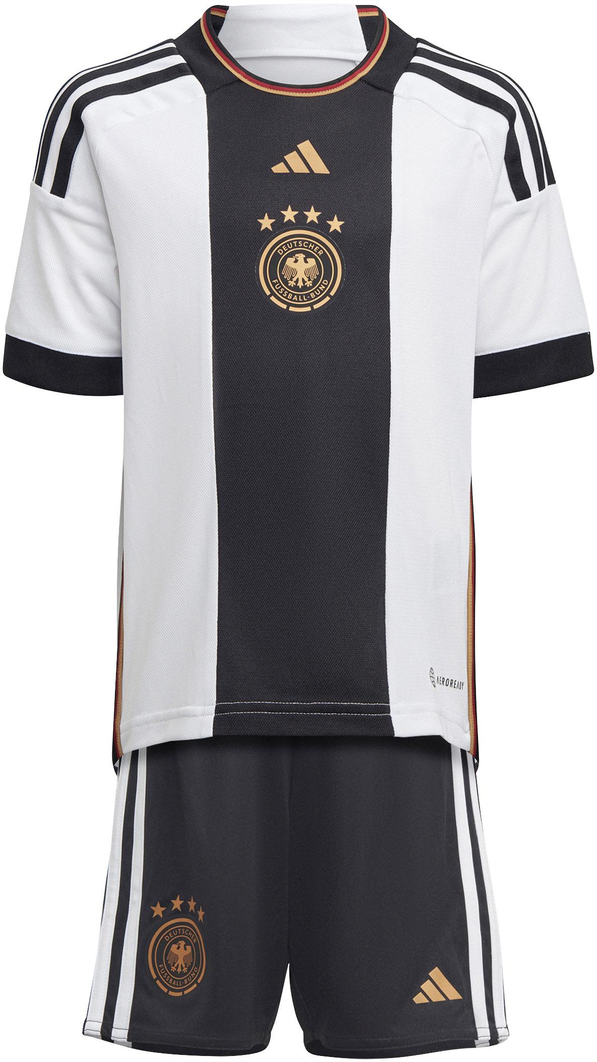 Fußball-Set des DFB für Kleinkinder, bestehend aus Trikot und Shorts; feuchtigkeitsableitend und schnelltrocknend dank AERO.RDY-Technologie; atmungsaktiv und strapazierfähig; mit 3-Streifen-Design, DFB-Wappen und Meisterschaftssternen; T-Shirt mit Rundhalsausschnitt und gerippten Ärmelbündchen; Shorts mit elastischem Bund; normale Passform; aus Recyclingmaterial hergestellt; Material 100% Polyester (recycelt).