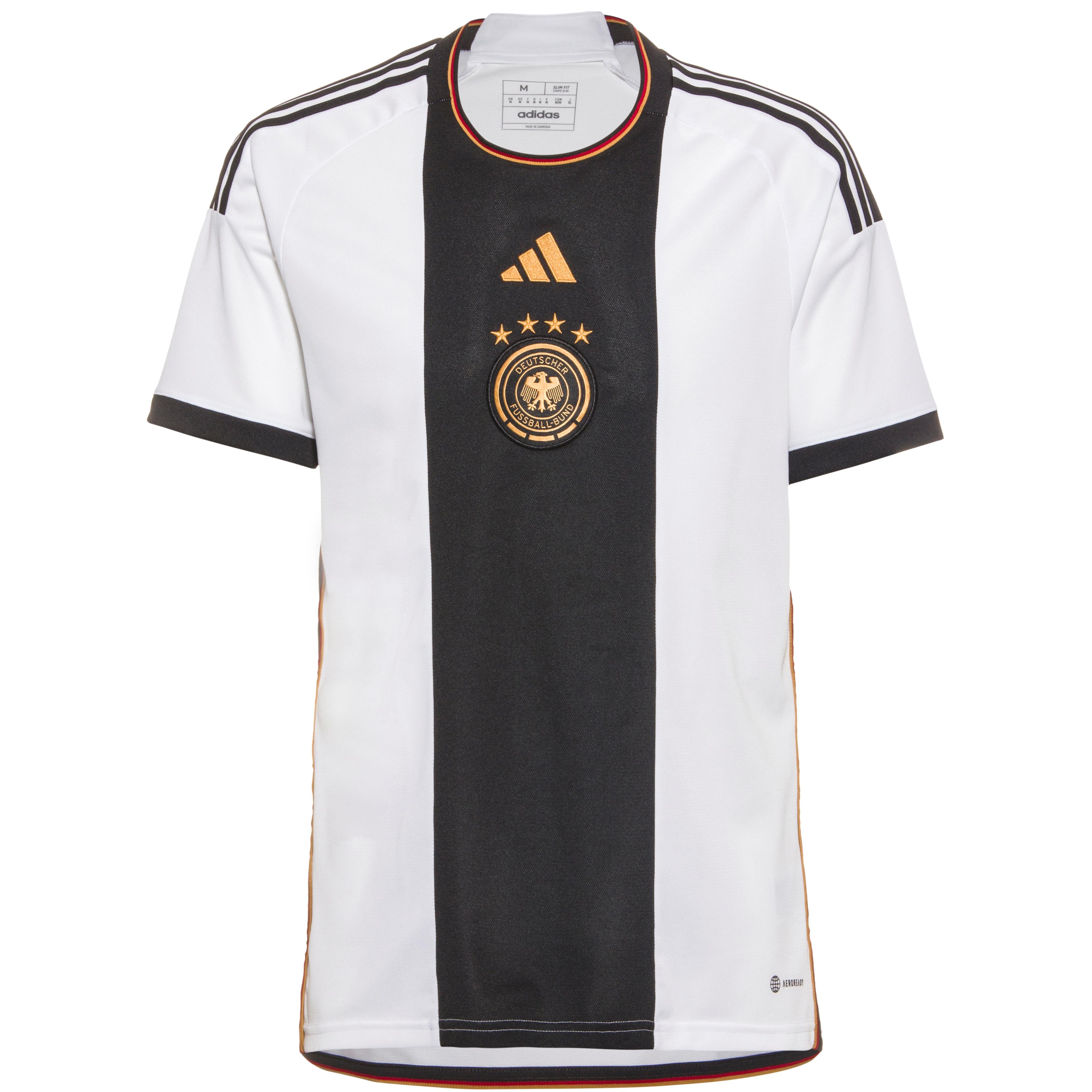 Trikot im Heimdesign der Deutschen Nationalmannschaft; feuchtigkeitsregulierend und schnelltrocknend dank AERO.RDY-Funktion; atmungsaktiv; strapazierfähig; Rundhalsausschnitt mit elastischer Einfasskante; Raglanärmel für optimale Bewegungsfreiheit; strategische platziertes Meshgewebe für angenehme Luftzirkulation; Marken-und Vereinsdetails auf der Front; verlängertes Rückenteil; Recyclingmaterial; Material 100% Polyester (recycelt).