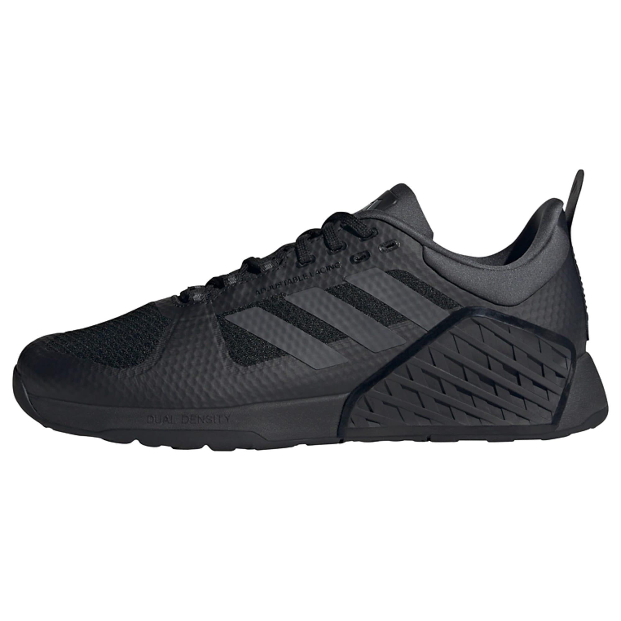 Fitnessschuhe aus atmungsaktivem Mesh-Obermaterial mit synthetischen Overlays; anpassbare Schnürung; Textilfutter; Zwischensohle mit Dual-Density-Dämpfung für Energierückführung und Stabilität; Ventilationsfenster an der Sohle hält den Fuß kühl und trocken; Sohle an den Seiten hochgezogen; hoch belastbare adiWEAR®-Außensohle mit Traxion™-Technologie für hervorragende Laufeigenschaften auf festem Untergrund; mit recycelten Materialien hergestellt.