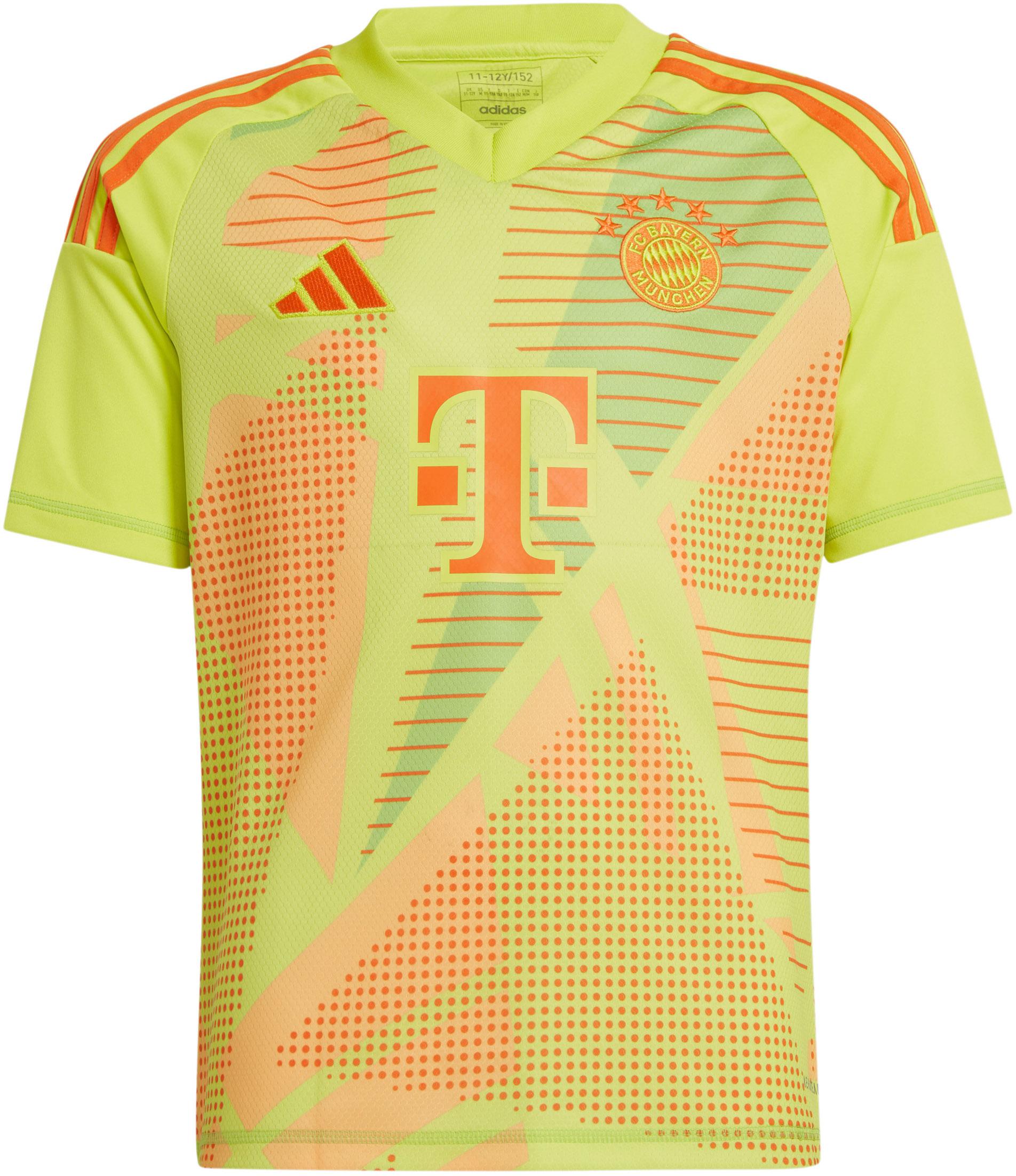 FC Bayern München Torwarttrikot für Kinder; leicht und strapazierfähig mit feuchtigkeitsableitender, schnelltrocknender und atmungsaktiver AERO.RDY-Technologie; V-Ausschnitt mit schmalem Kragen; 3-Streifen an den Schultern; geometrischer Print auf der Vorderseite; Logos auf der Brust; Schriftzug auf der Rückseite; Material 100% Polyester (recycelt).