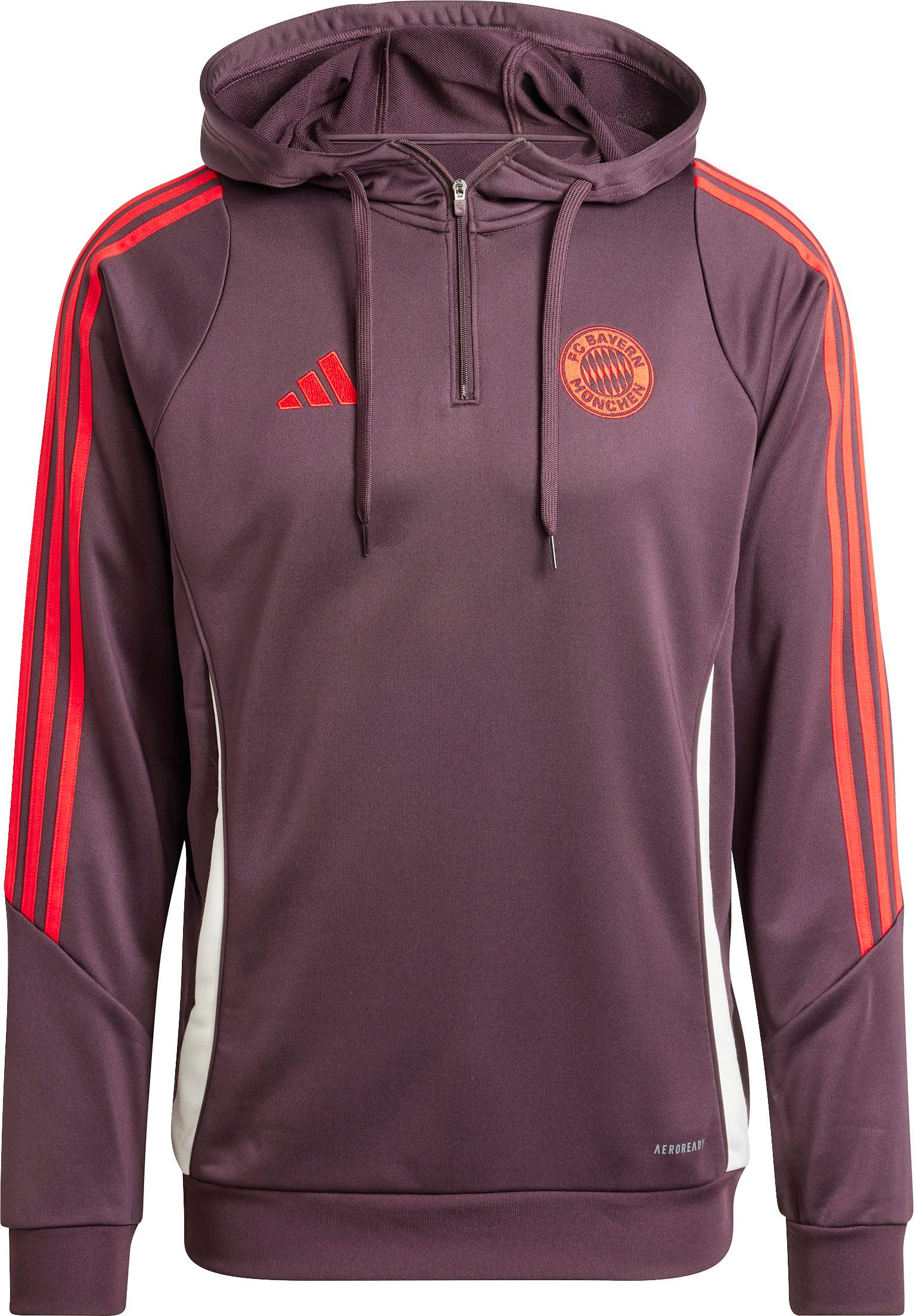 Sportiver Hoodie im Design des FC Bayern München; feuchtigkeitsregulierend und schnelltrocknend dank AERO.RDY-Funktion; atmungsaktiv und strapazierfähig; Kapuze mit Kordelzug; Kragen mit halblangem Reißverschluss auf der Vorderseite; typische 3-Streifen an den Ärmeln; Marken- und Vereinslogo auf der Brust; breite Bündchen an Saum und Ärmeln; Material 100% Polyester (recycelt).