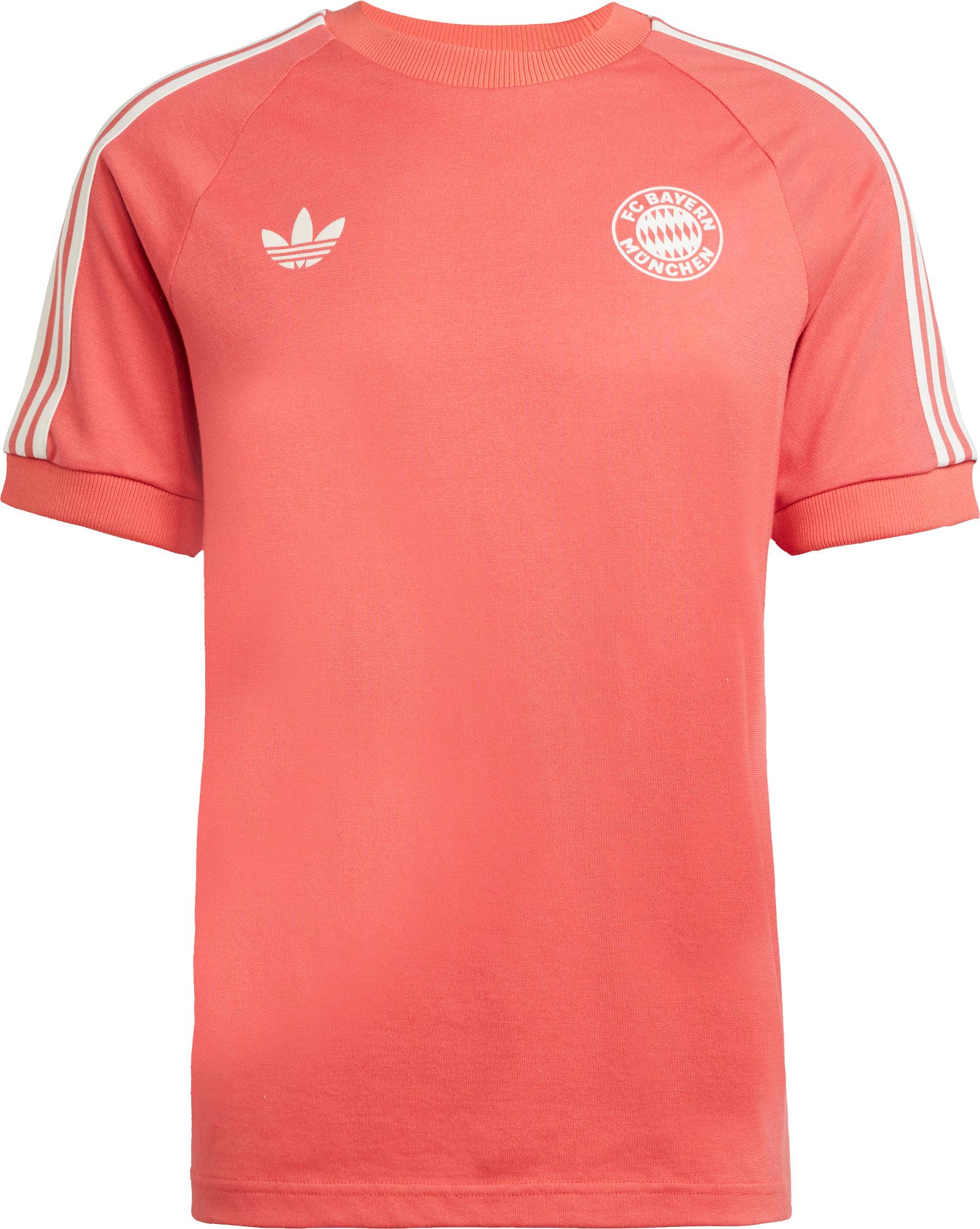 T-Shirt für Fans des FC Bayern München; Rundhalsausschnitt; typische 3-Streifen an den Schultern; Marken- und Vereinslogo auf der Brust; Schriftzug auf dem Rücken; normale Passform; Material 52% Baumwolle, 48% Polyester (recycelt).