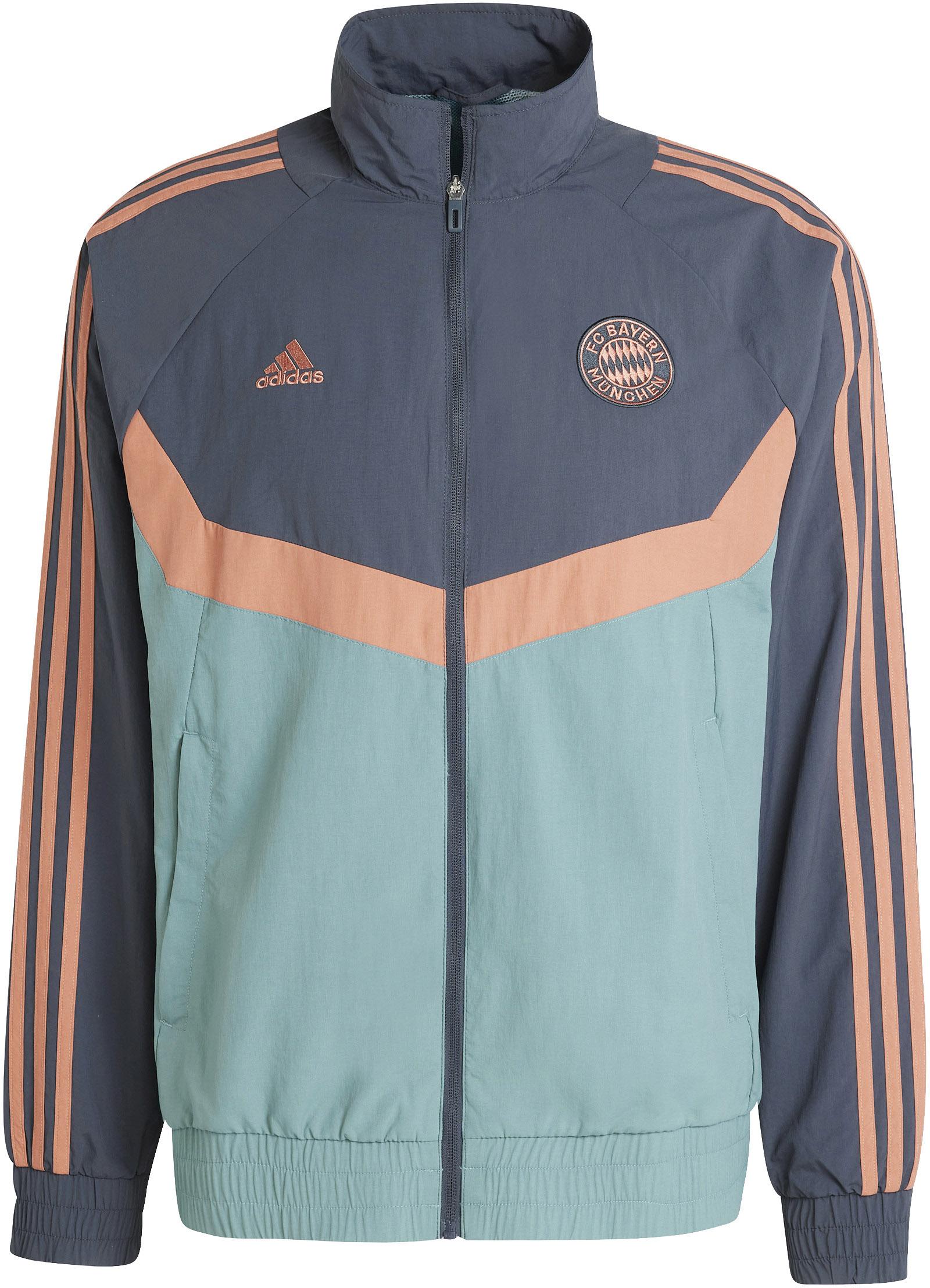 Trainingsjacke für Fans des FC Bayern München; Colourblock-Design mit Vereins- und Markenlogo auf der Brust; Stehkragen; durchgehender Frontreißverschluss; 3-Streifen an den Armen; 2 seitliche Reißverschlusstaschen; elastische Bündchen an Saum und Ärmeln; Material 100% Polyamid (recycelt).