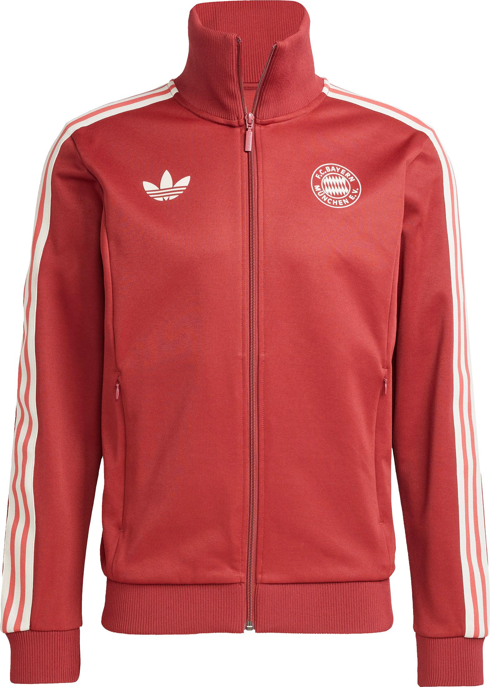 Trainingsjacke im Design des FC Bayern München; aus weichem Baumwollmix; hoher, gerippter Stehkragen und breite Rippbündchen an Saum und Ärmeln; durchgehender Frontreißverschluss; Marken- und Vereinslogo auf der Brust; typische 3-Streifen entlang der Arme; Schriftzug auf dem Rücken; 2 Seitentaschen mit Reißverschluss; Material 52% Baumwolle, 48% Polyester (recycelt).