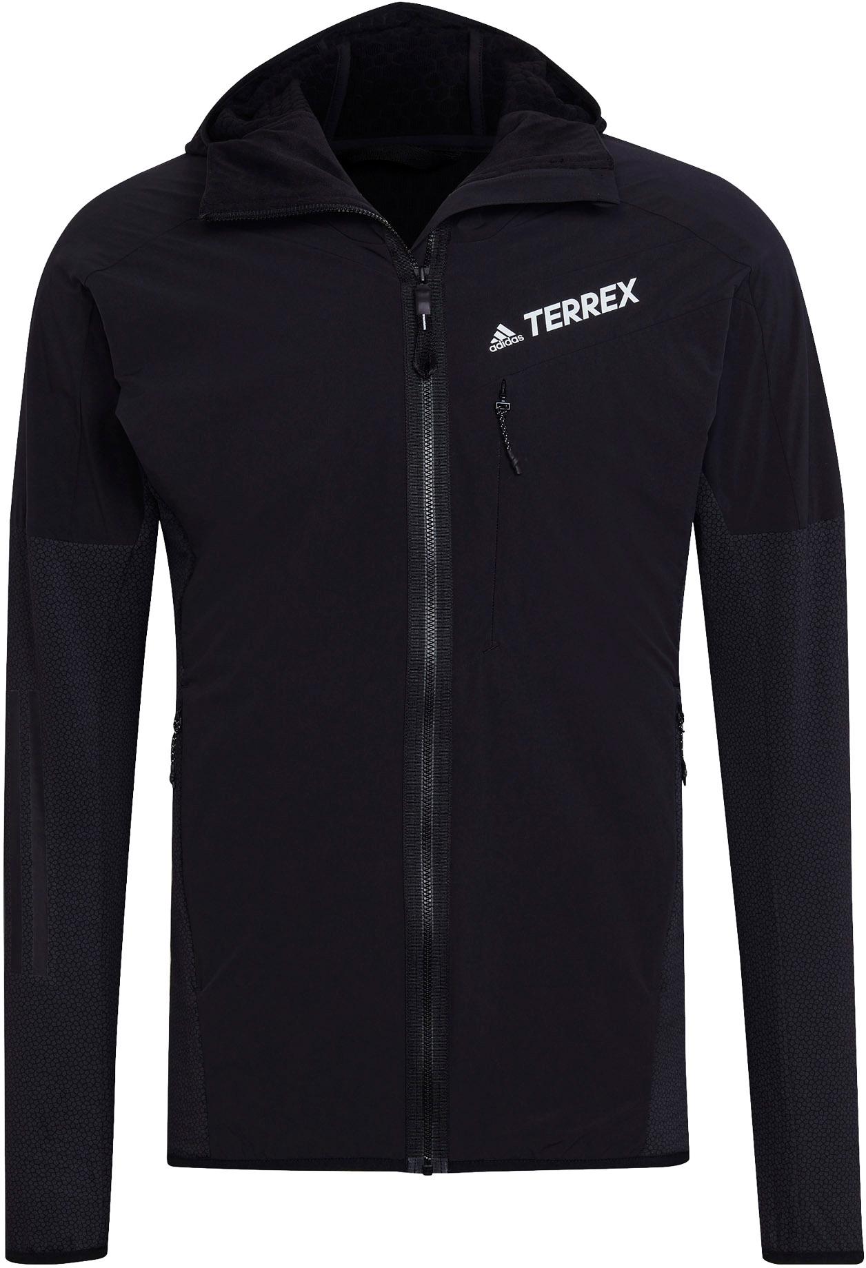 Terrex-Fleecejacke – ideal für Bergsteiger; feste, helmtauglicher Kapuze; hoch geschlossener Kragen mit Kinnschutz; durchgehender Frontreißverschluss; 1 rucksacktaugliche Brusttasche mit Reißverschluss; Terrex-Schriftzug auf der Brust; 2 einhändig zu öffnende Reißverschlusstaschen; Abschlüsse mit schmalen Elastikbündchen; schmale Passform; mit recycelten Materialien hergestellt; Material 95% Polyester (recycelt), 5% Elastan.