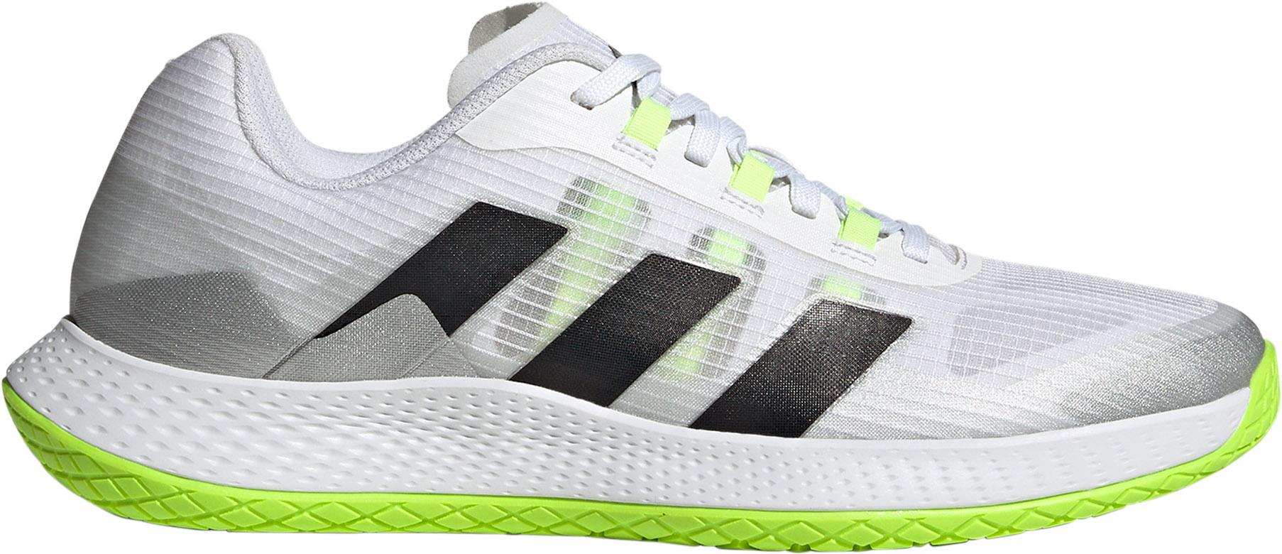 Hallenschuhe mit durchgehender Bounce™ Zwischensohle für Dämpfung und Unterstützung beim Abspringen und Landen; robustes Ripstop-Obermaterial mit stabilisierenden Synthetik-Overlays; mit Schnürung; Textilfutter; stabilisierende Elemente innen; Gummi-Außensohle mit 360° Gripprofil; mit Recyclingmaterial hergestellt.
