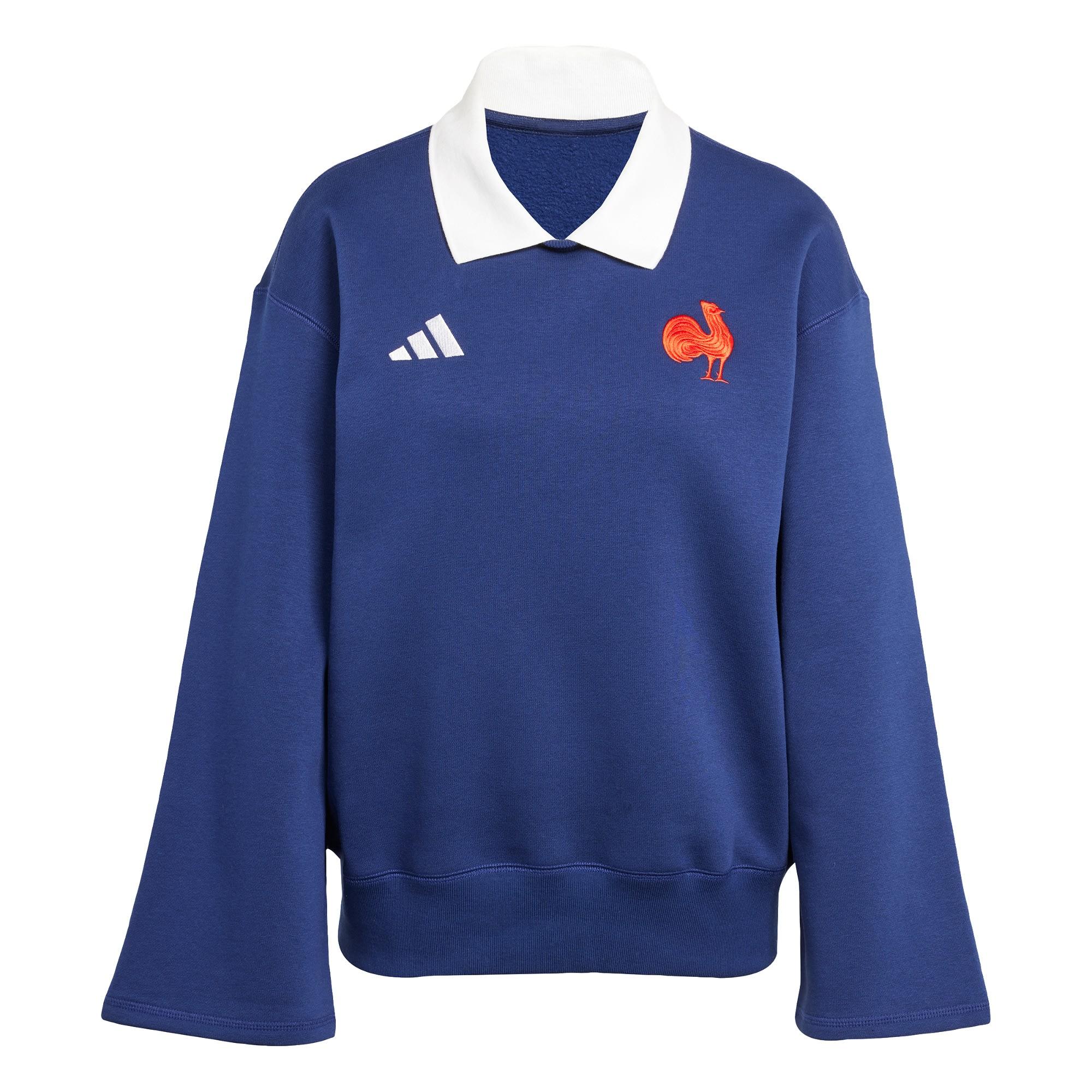 Mit diesem adidas Sweatshirt feierst du die lange Tradition des Rugbysports in Frankreich. Es präsentiert sich im Dunkelblau der Spielausrüstung und kommt mit einem kontrastierenden gallischen Hahn in Rot. Rundum die perfekte Kombi, um auch in der Freizeit deinen Support für das französische Rugby-Union-Nationalteam zu zeigen. Der Baumwollmix mit angerauter Innenseite und die lockere Passform sorgen für ein bequemes Tragegefühl, egal ob du gerade ein Spiel verfolgst oder unterwegs bist.