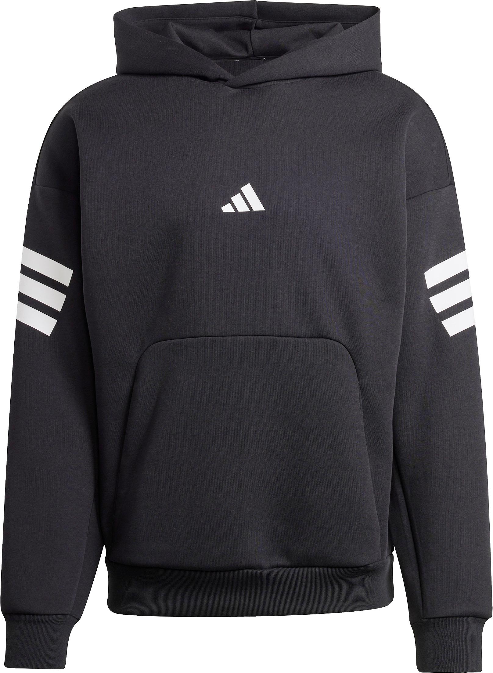 Hoodie mit Kängurutasche; Logodetail auf der Brust und schräg verlaufende 3-Streifen an den Ärmeln; überschnittene Schultern; Rippbündchen an Saum und Ärmeln; Material 67% Polyester (recycelt), 33% Baumwolle.