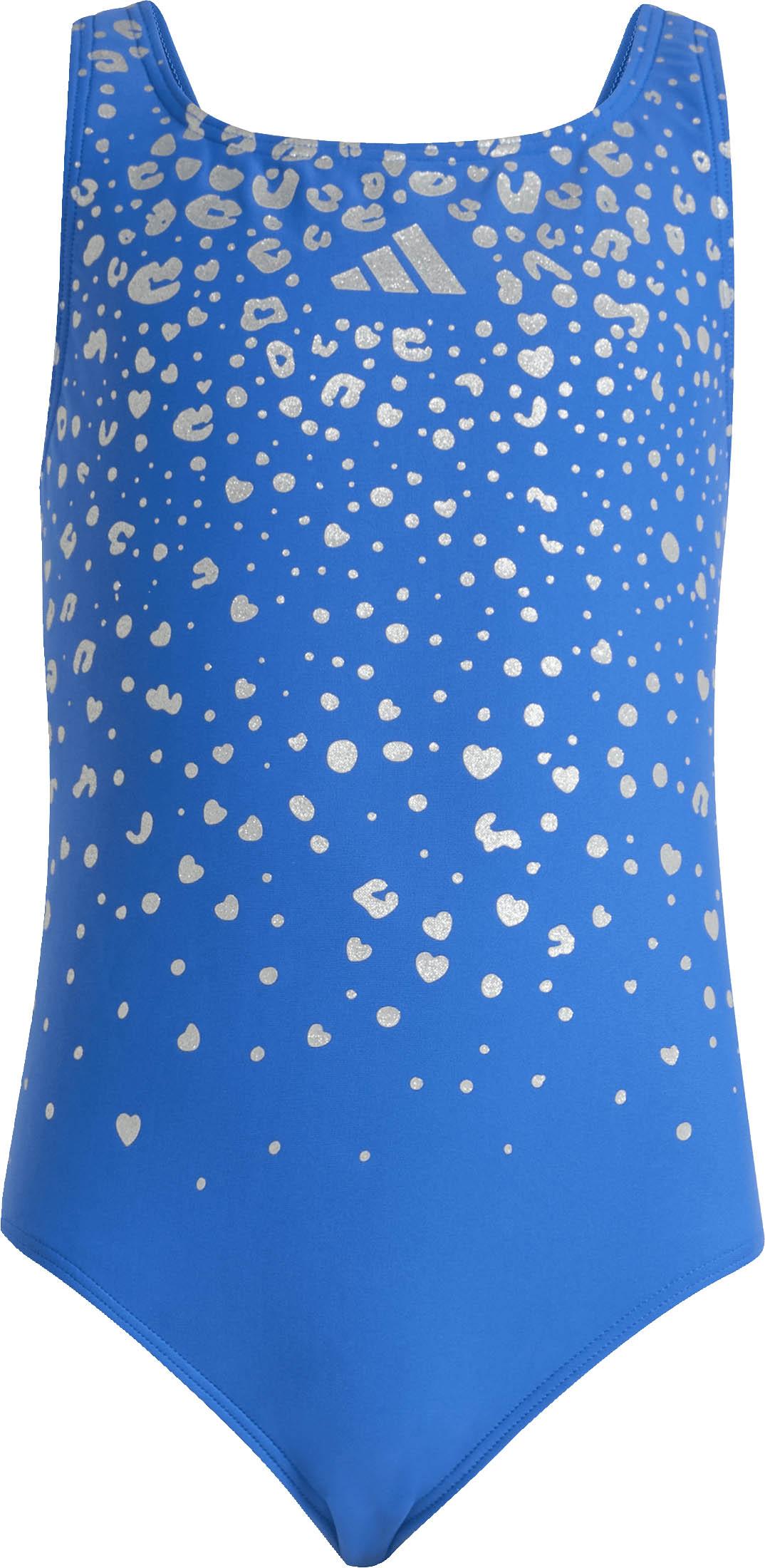 Badeanzug mit schimmerndem Print für Mädchen; weiches, schnelltrocknendes Material; 3 Bar-Logo auf der Vorderseite; normale Träger; mittlerer Hals- und Beinausschnitt; v-förmiges Rückendesign mit Cut-out; mit Recyclingmaterial hergestellt; Material 80% Polyamid (recycelt), 20% Elastan.