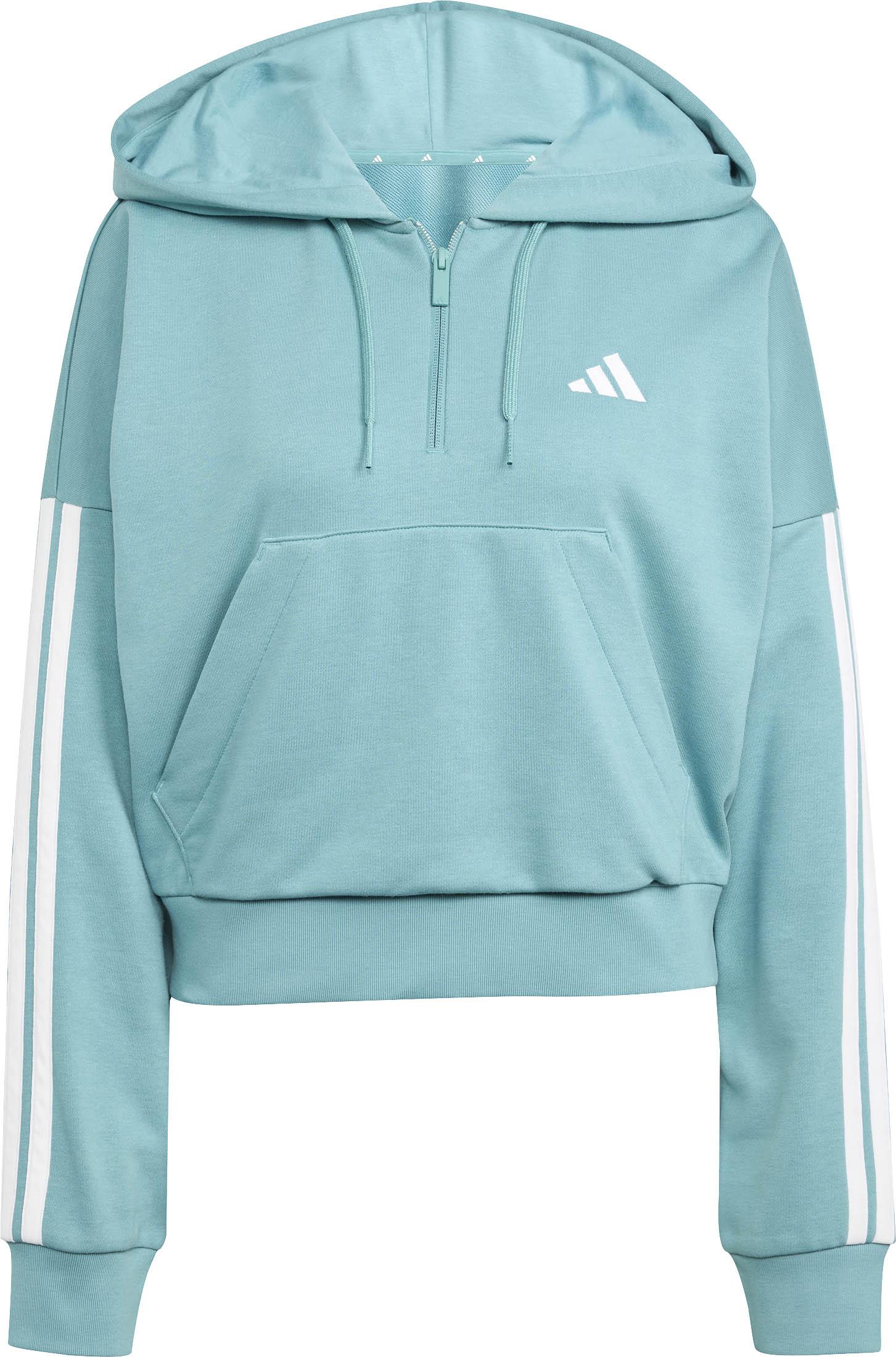 Hoodie aus weichem French-Terry-Material; leicht verkürzte, lockere Passform mit herabgesetzten Schulternähten; Kapuze mit Kordelzug; kurzer Frontreißverschluss; kleines Logo auf der Brust; 3-Streifen entlang der Ärmel; Kängurutasche; Saum und Ärmelabschlüsse mit breiten Rippbündchen; Material 55% Baumwolle, 36% Polyester (recycelt), 9% Viskose.