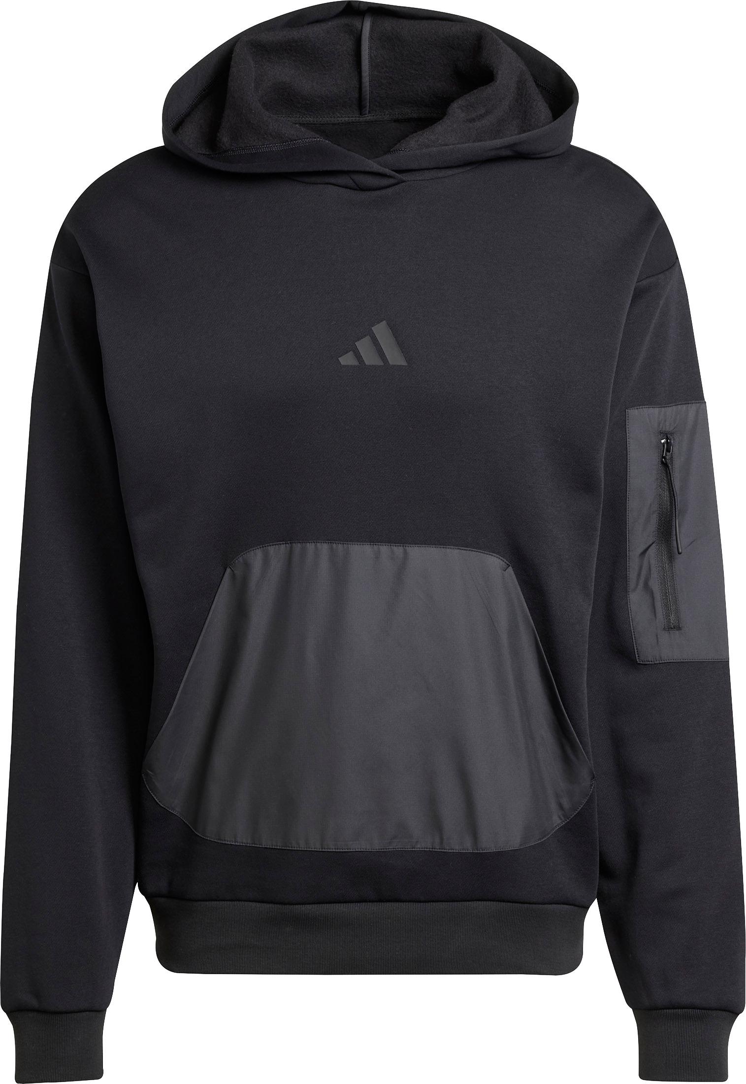 Hoodie aus weichem Baumwollmix mit flauschiger Innenseite; Kängurutasche und Reißverschlusstasche am Ärmel aus kontrastierendem Gewebe; Rippbündchen an Ärmeln und Saum; Material 70% Baumwolle, 30% Polyester (recycelt).