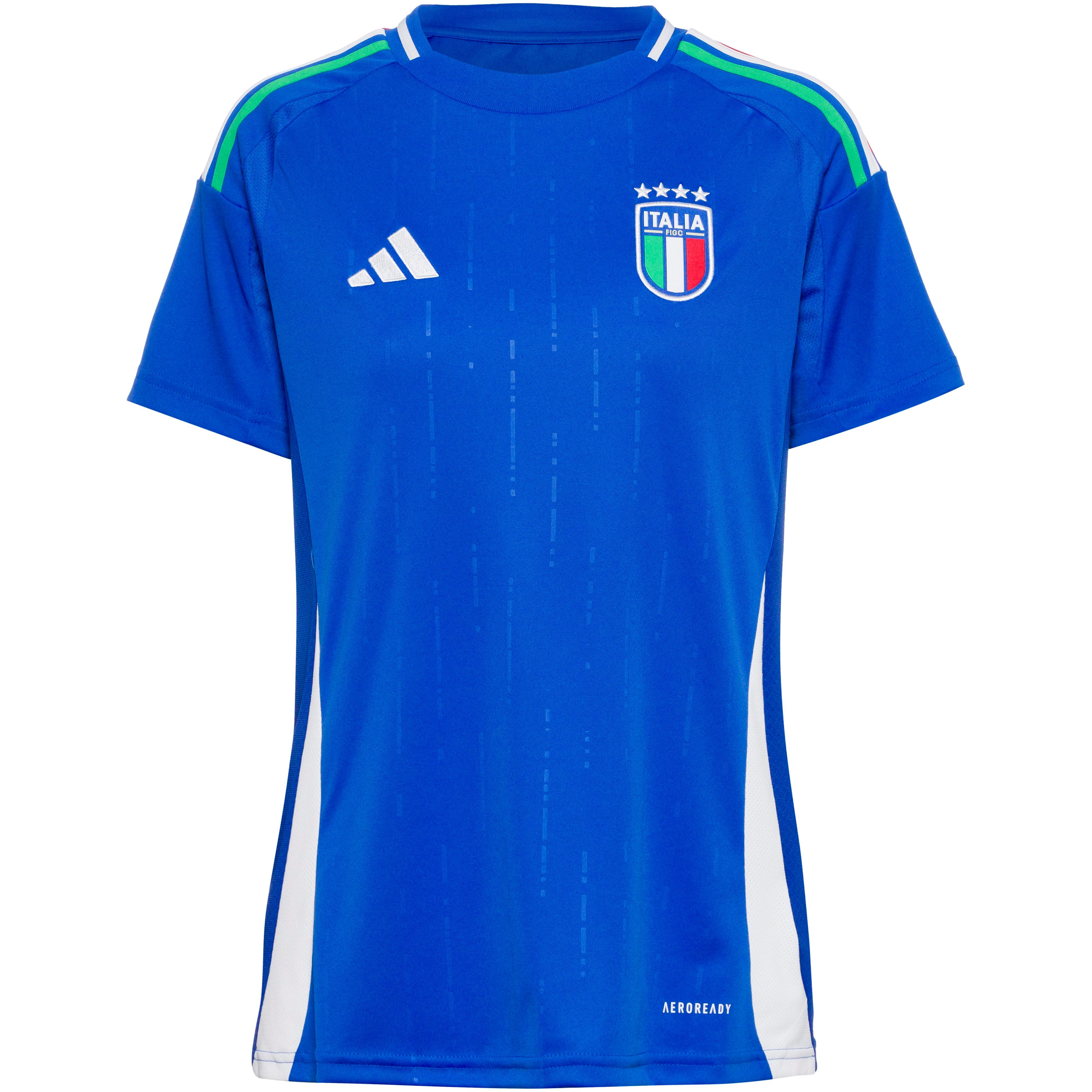 Heimtrikot der italienischen Nationalmannschaft für die UEFA EURO 2024; feuchtigkeitsableitend und schnelltrocknend dank AERO.RDY-Technologie; atmungsaktiv; strapazierfähig; Rundhalsausschnitt; Logostickerei und Nationalwappen auf der Vorderseite; 3-Streifen in den Nationalfarben an den Schultern; aus Recyclingmaterial hergestellt; Material 100% Polyester (recycelt).