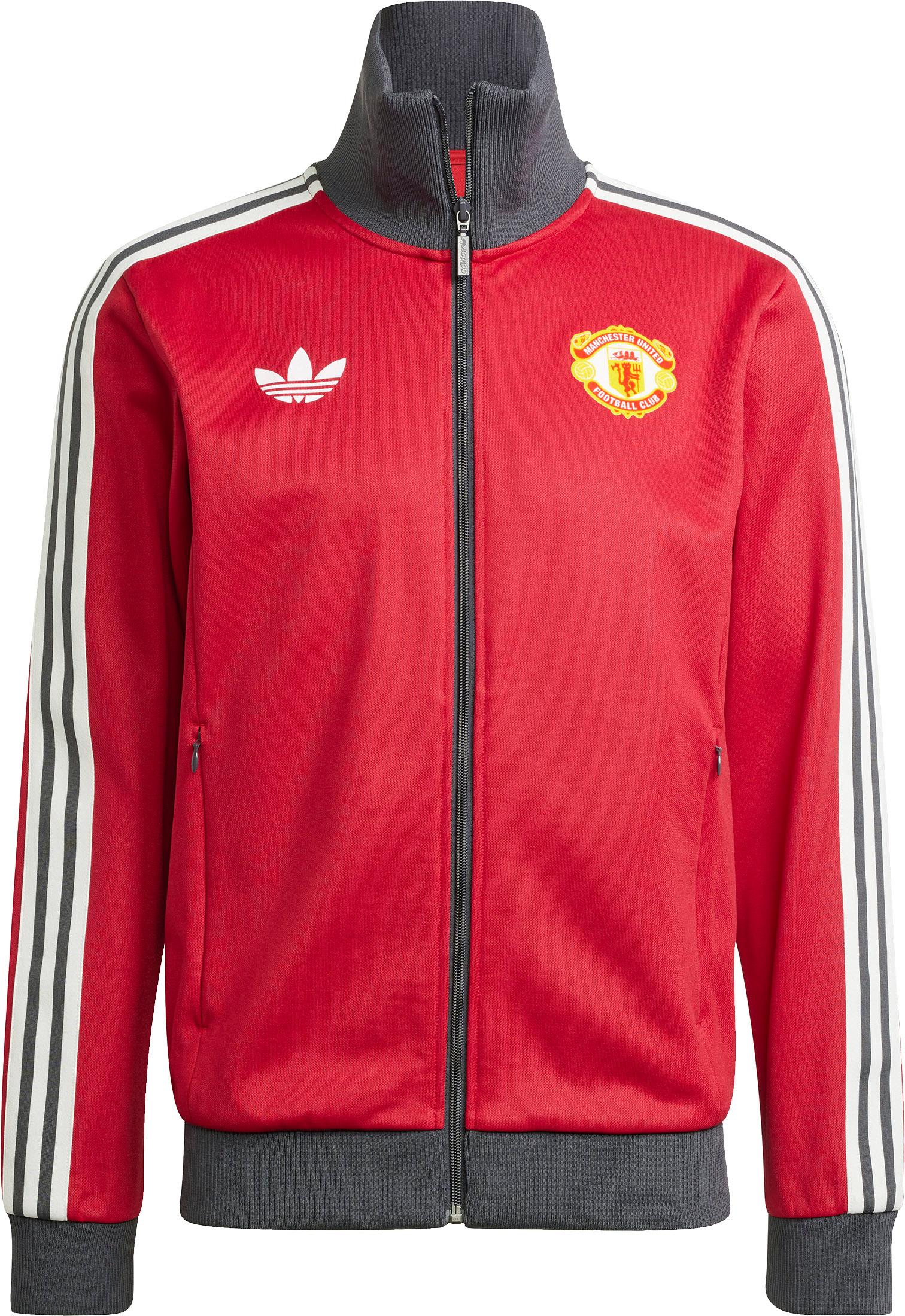Manchester United Trainingsjacke aus weichem Baumwollmix; hoher, gerippter Stehkragen und breite Rippbündchen an Saum und Ärmeln; durchgehender Frontreißverschluss; Marken- und Vereinslogo auf der Brust; typische 3-Streifen entlang der Arme; Schriftzug auf dem Rücken; 2 Seitentaschen mit Reißverschluss; Material 52% Baumwolle, 48% Polyester (recycelt).