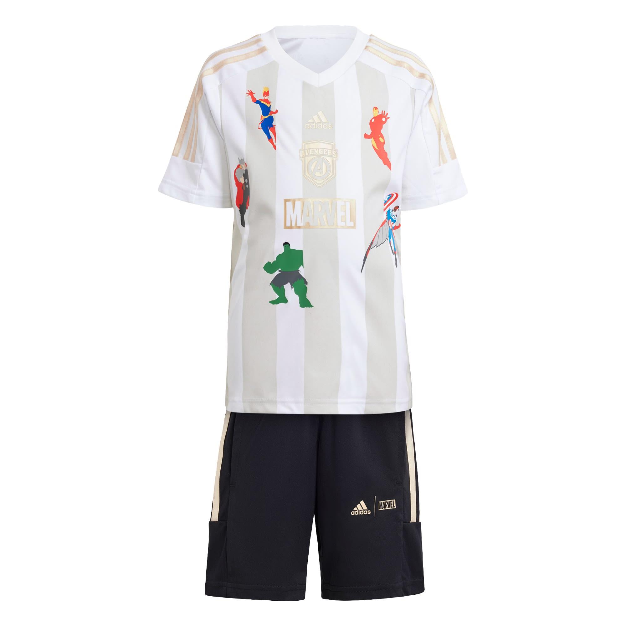 Mach dich bereit für dein nächstes Abenteuer. Mit diesem von Superhelden inspirierten adidas Set aus T-Shirt und Shorts für Kinder zeigt dein kleiner Schatz seine Begeisterung für die Avengers. Das T-Shirt zeigt farbenfrohe Grafiken der Superheld_innen von Marvel in Aktion, während die Wappen und Streifen im Block-Style für einen trikotähnlichen Look sorgen. Das vielseitige Design ist nicht nur stylish, sondern macht auch auf dem Spielplatz eine gute Figur. Dieses Produkt ist mit 100 % recycelten Materialien hergestellt. Die Wiederverwendung bereits vorhandener Materialien hilft uns dabei, Müll zu reduzieren, unsere Abhängigkeit von nicht erneuerbaren Ressourcen einzuschränken und den CO2-Fußabdruck unserer Produkte zu verringern.