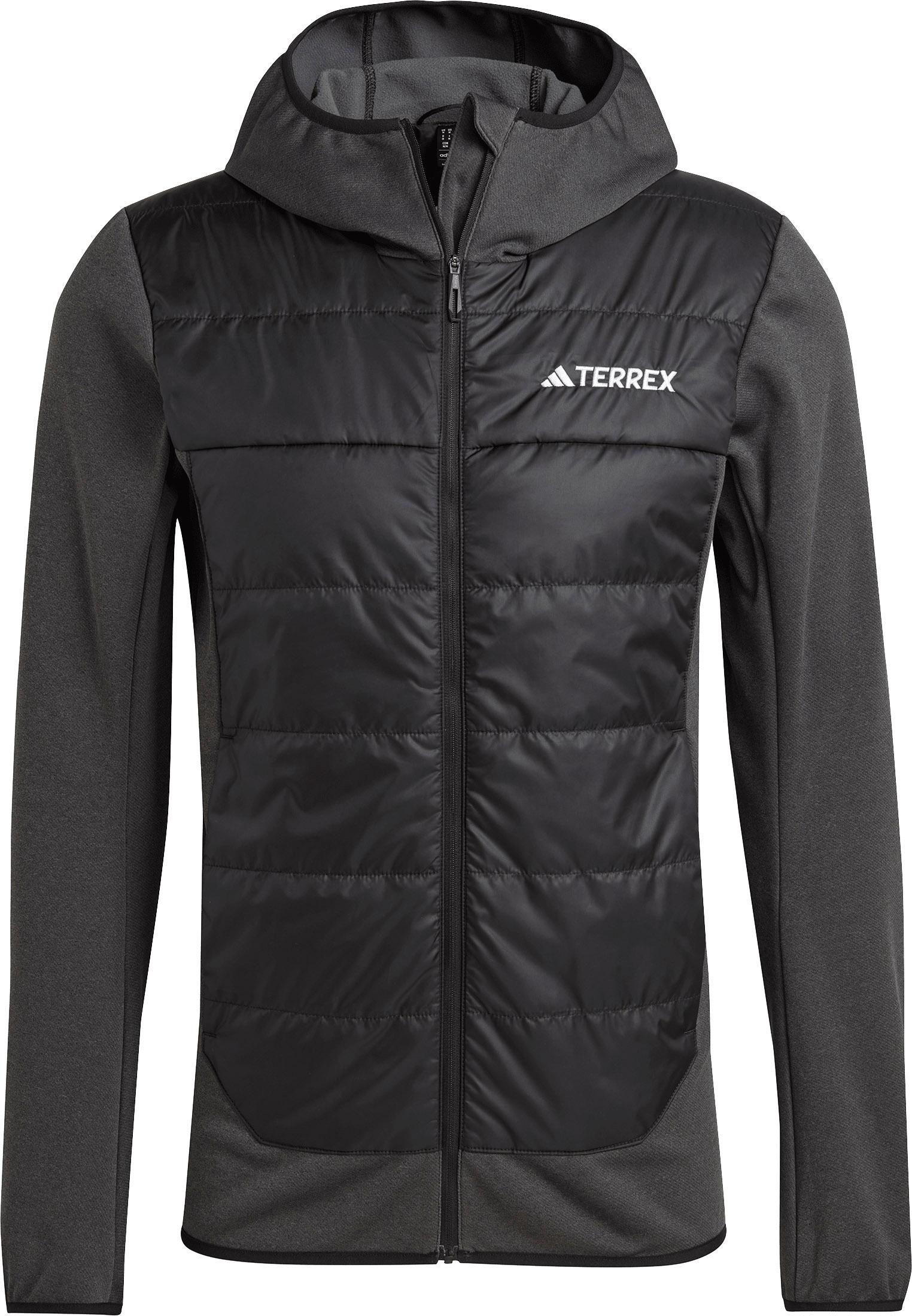 Hybridjacke mit ohne PFC hergestellter, dauerhaft wasserabweisender Imprägnierung; atmungsaktives und thermoregulierendes Fleecematerial; Vorderseite und Schulterbereich gesteppt, mit wärmender Terrex-Synthetikfüllung; Kapuze mit hohem Kragen; durchgehender Frontreißverschluss mit Kinnschutz; 2 seitliche Reißverschlusstaschen; elastische Saumeinfassungen; Material 100% Polyester (recycelt).