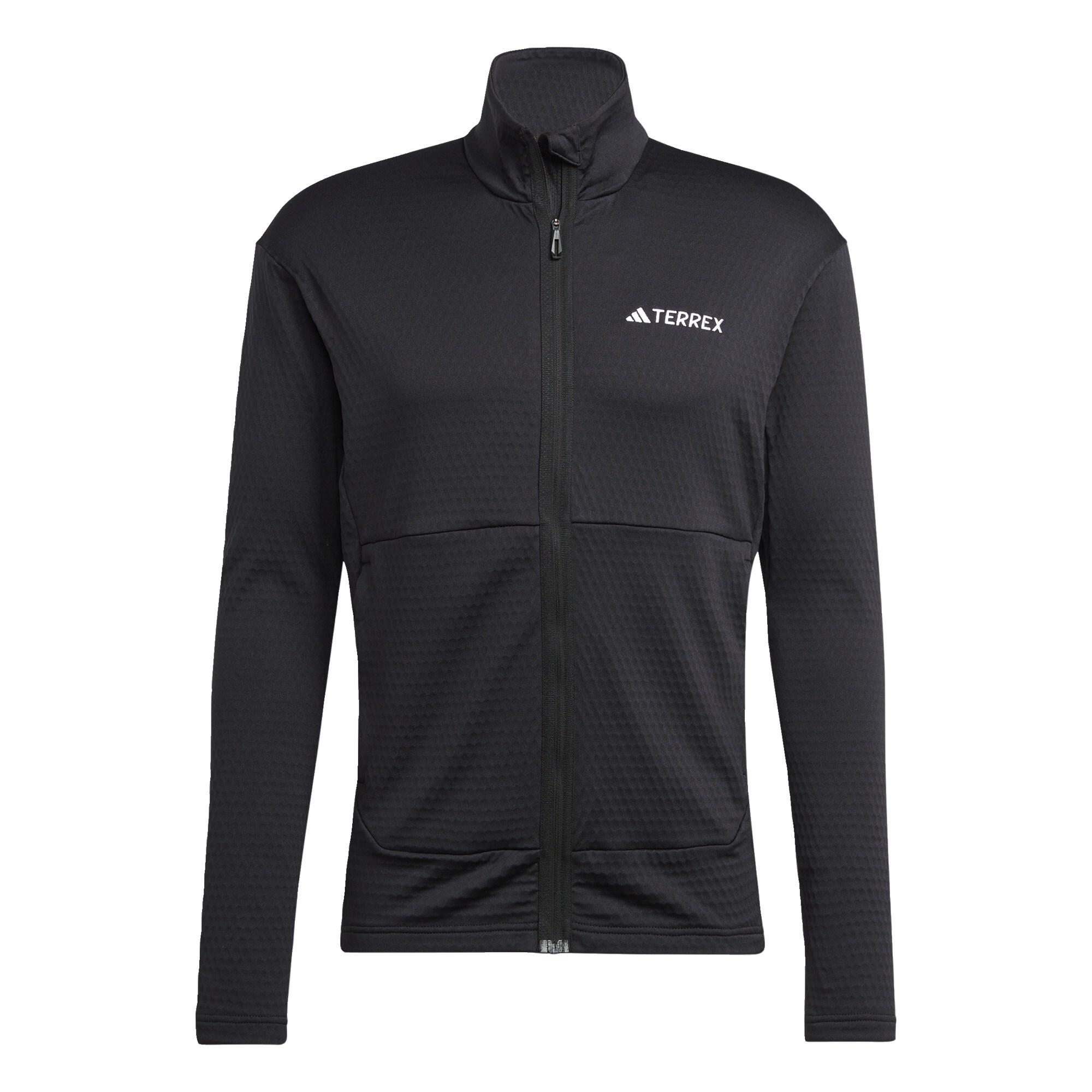 Weiche Fleecejacke mit 2 Reißverschlusstaschen; exzellentes Feuchtigkeitsmanagement und Atmungsaktivität dank TERREX Flooce-Material mit wärmender Wabenstruktur; hervorragend als Midlayer unter einer äußeren Jacke geeignet; Stehkragen und durchgehender Frontreißverschluss; Logo auf Brusthöhe; mit Recyclingmaterial hergestellt; Material 95% Polyester, 5% Elastan.