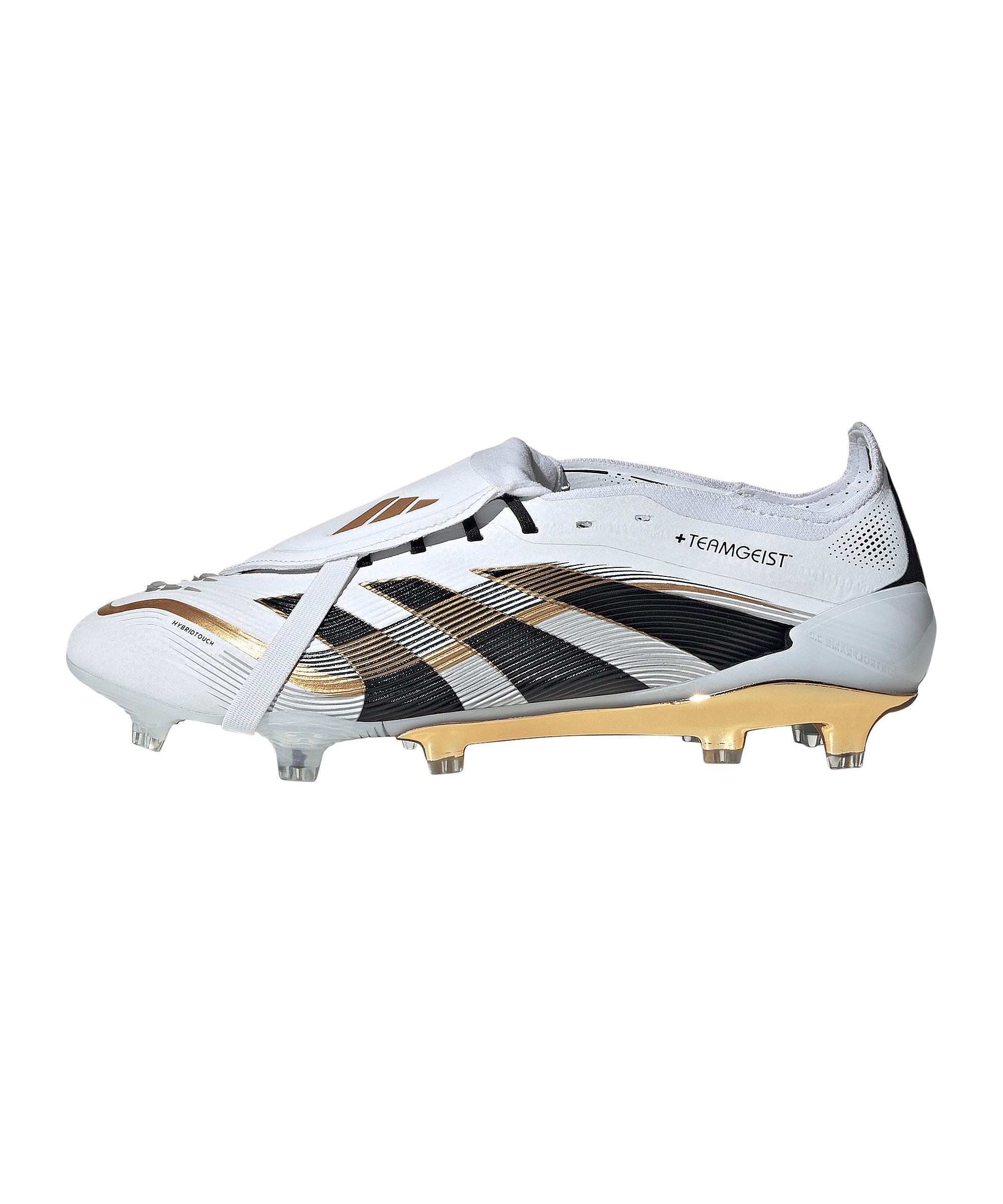 Der weiszlig;e adidas Predator Elite FT FG mit Umschlagzunge ist ein Topmodell fuuml;r Erwachsene mit Control-Charakteristik. Diese feinfuuml;hligen adidas Rasenfuszlig;ballschuhenbsp;kommen mit Nockensohle fuuml;r festen Naturrasen. Diese quot;Teamgeistquot;-Variante ist eine Hommage an den legendauml;ren und damals technisch revolutionauml;ren adidas Teamgeist Spielball fuuml;r die Fuszlig;ball-WM 2006 mit organisch geschwungener Panel-Konstruktion in Weiszlig;, Schwarz und Gold. Das Sondermodell Predator Teamgeist bringt das Flair desnbsp;Spielballs nbsp;und den Spirit der WM 2006nbsp;ins Fuszlig;ball-Jahr 2025 und begeistertnbsp;mitnbsp;leckerennbsp;Gold-Getails und teilgoldener Sohle (dienbsp;wird sich mit dem Spielen natuuml;rlich abnutzen und entsprechend Charakter entwickeln). Das macht diesen Predator Fuszlig;ballschuh definitiv zu etwas Besonderem. Schauen wir uns die Boots im Detail an: Predator Profi-Modell von adidas adidas Elite Fuszlig;ballschuhe sind kompromisslos die am besten ausgestatteten Optionen im Lineup. Klar konzipiert als absolutes Profi-Material fuuml;r Weltklasse-Fuszlig;baller wie Gabriel Jesus oder Jude Bellingham. Genau diese Boots bekommst du hier. Den Predator Elite bietet dir adidas in drei Varianten an: 1) klassisch Retro mit Umklappzunge 2) Laceless ohne Schnuuml;rung und 3) klassisch Low mit Schnuuml;rung. Beim High-End-Predator hast du die freie Auswahl. Fuuml;r alle, die volle Kontrolle und Prauml;zision wollen Egal ob Midfielder oder Striker, ob Standard-Spezialist oder Strafraumwiesel - der Predator gibt dir prauml;zise dosierbaren Grip und volle Kontrolle uuml;ber Ball und Boden. Genau das, was sich technisch starke Control Player wuuml;nschen. adidas spricht hier marketingspektakulauml;r von quot;Redefined Predator Control DNArdquo;. Wir halten nicht viel von Marketing-Blabla. Aber wir halten den adidas Predator durch die gesamte Modellpalette hindurch fuuml;r absolut geeignet, um deine Fauml;higkeiten voll auf den Platz zu bringen.lt;. Mit FG-Sohle fuuml;r festen Naturrasen Die adidas FG-Rasensohle fuuml;r den Predator kommt mit markantem Nockenprofil. FG steht fuuml;r Firm Ground (also festen Naturrasen). Die eigenwilligen Dreiecksfluuml;gelnocken sind speziell entwickelt und strategisch passend platziert. Die Sohlenkonstruktion gibt dem adidas Predator auf festem Naturrasen seine typische Control-Charakteristik mit wendiger Performance in alle Richtungen. Die ELITE Topmodelle geben mit ihrer detailreich designten High-End-FG-Sohle den Predator-Signature Look vor. Dieser zieht sich durch die Modell-Linie und gibt jeder Preisstufe darunter etwas vom Look amp; Feel der Spitzen-Predators. Und die Dreieckfluuml;gelnocken funktionieren selbst bei den preiswerteren FG-Modellen exzellent. Fuuml;r den klassischen Vereinsbetrieb auf Naturrasenspielfeld die perfekte Sohlenwahl. Groszlig;artig ausgetattet und absolut Top Tier Folgende Features und Vorteile bieten dir die adidas Predator Elite FT FG Fuszlig;ballschuhe: Klassische Umschlagzunge mit beschriftetem Gummihalteband fuuml;r echte Old-School-Vibes Mit Schnuuml;rung fein dosierbar und direkt durchs Upper fuuml;r den perfekten individuellen Fit PRIMEKNIT-Kragen duuml;nn, elastisch anschmiegsam und leicht HYBRID TOUCH 2.0 Upper weiches Synthetikleder plus Schutzhaut fuuml;r Top Level Passform und Komfort STRIKESKIN Predator-typische 3D-Gummilippen fuuml;r uuml;berlegenen Grip und Drall am Ball Predator 3-Stripes geschwungene Version der drei adidas-Streifen fuuml;r einen kraftvollen Signature-Look CONTROLFRAME 2.0 Topmodell-Sohle mit Signature-Look und tollen Features fuuml;r Control-Player: Hightech-Kunststoff sehr biegsames und hochwertiges Sohlenmaterial fuuml;r professionelle Anspruuml;che Perfektes Profil fuuml;r festen Naturrasen Dreifluuml;gelnocken fuuml;r wendige Agilitauml;t, uuml;berraschende Richtungswechsel und festen Schuss-Stand Stuuml;tzende Fersenkappe fuuml;r stabilisierenden Support bei dynamischen Moves und prauml;zisen Schuuml;ssen Antirutsch-Einlegesohle perforiert, superleicht und fuszlig;fixierend fuuml;r optimale Verbindung zur Sohle Direkt vom adidas autorisierten Hauml;ndler Bei 11teamsports kannst du adidas Predator Fuszlig;ballschuhe guuml;nstig kaufen. Als Top Tier Fuszlig;ballspezialist in Europa bieten wir dir selbstverstauml;ndlich das komplette Lineup - inklusive der richtig heiszlig;en Exklusive-Modellen, Limited Runs und tollen Special Editions. Produktdetails: Typ: adidas Rasenfuszlig;ballschuhe Sondermodell im Design des Spielballs der WM 2006 Grouml;szlig;enlauf: fuuml;r Erwachsene (Unisex fuuml;r Herren und Damen) Silo: Predator Modell: Elite Preisstufe: Topmodell Sohle: FG (Firm Ground) Einsatzbereich: fester Naturrasen Kragenschnitt: Umschlagzunge Material: Obermaterial: Textil, Synthetik Innenfutter: Textil Laufsohle: sonstiges nbsp;