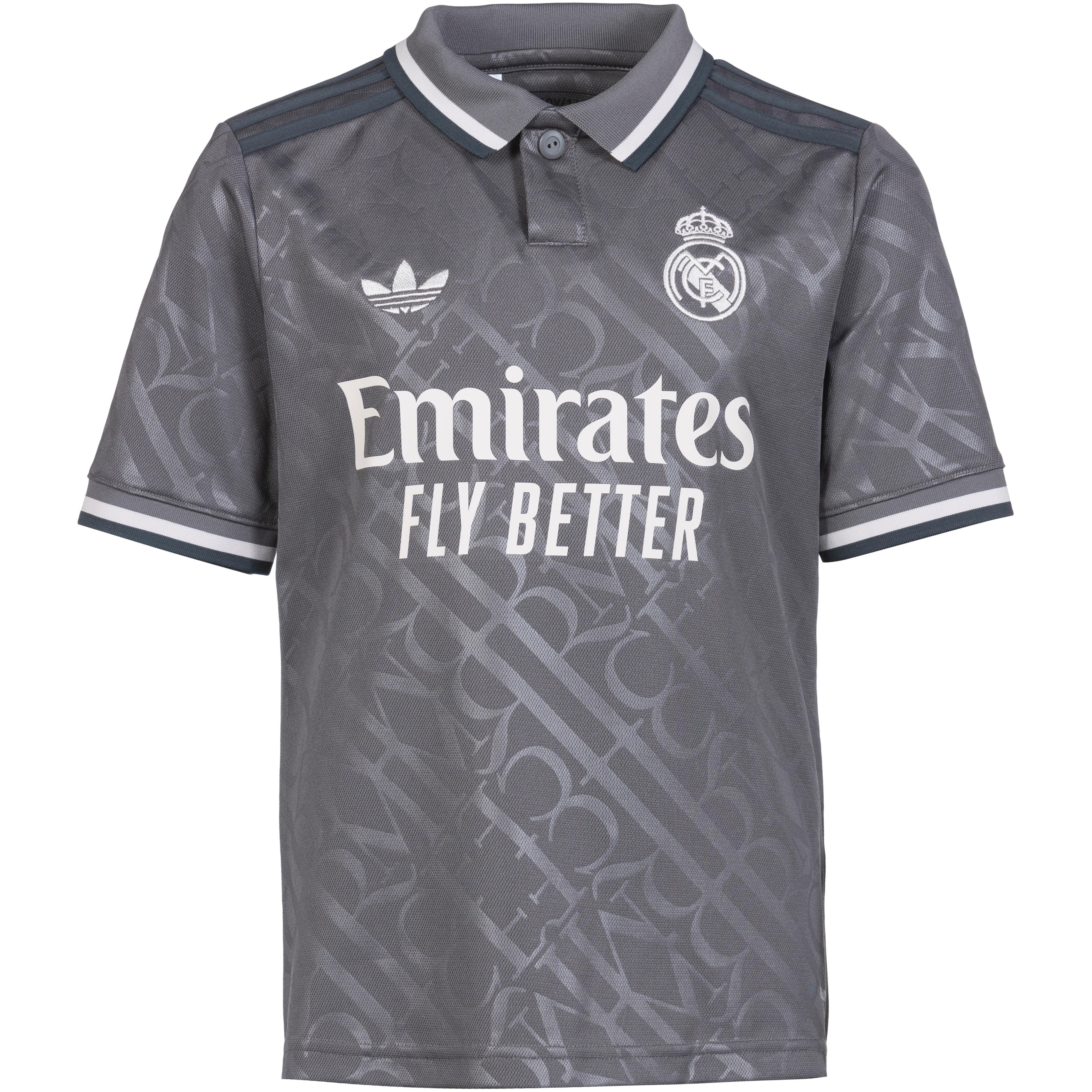 Real Madrid Ausweichtrikot für Kinder; Saison 2024/25; feuchtigkeitsregulierend und schnelltrocknend dank AERO.RDY-Technologie; atmungsaktiv und strapazierfähig; dezenter RMCF-Allover-Print; Polokragen mit Knopfverschluss; klassische 3-Streifen an den Schultern; diverse Logos auf der Brust; elastische Ärmelbündchen; Material 100% Polyester (recycelt).