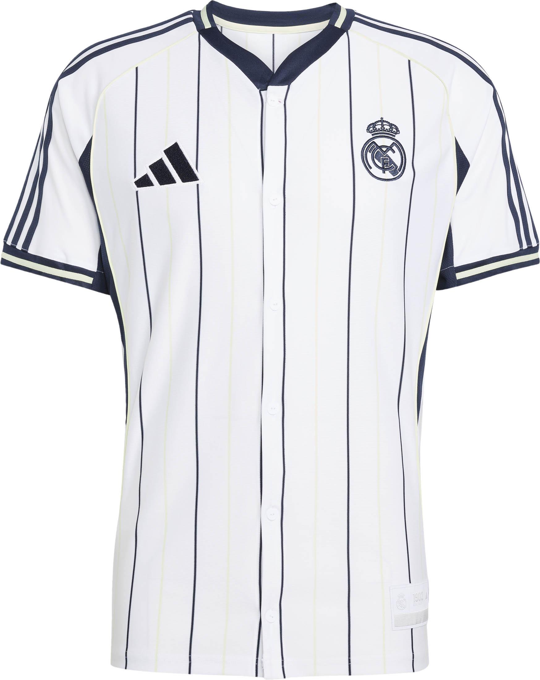 Fanshirt von Real Madrid in Baseball-inspiriertem Design; gestreiftes Muster; V-Ausschnitt mit angeschnittenem Kragen; durchgehende Knopfleiste; Raglanärmel; Vereinswappen und Logodetail auf der Vorderseite; großer Real Madrid-Print am Rücken; normale Passform; vollständig aus Recyclingmaterial hergestellt; Material 100% Polyester (recycelt).