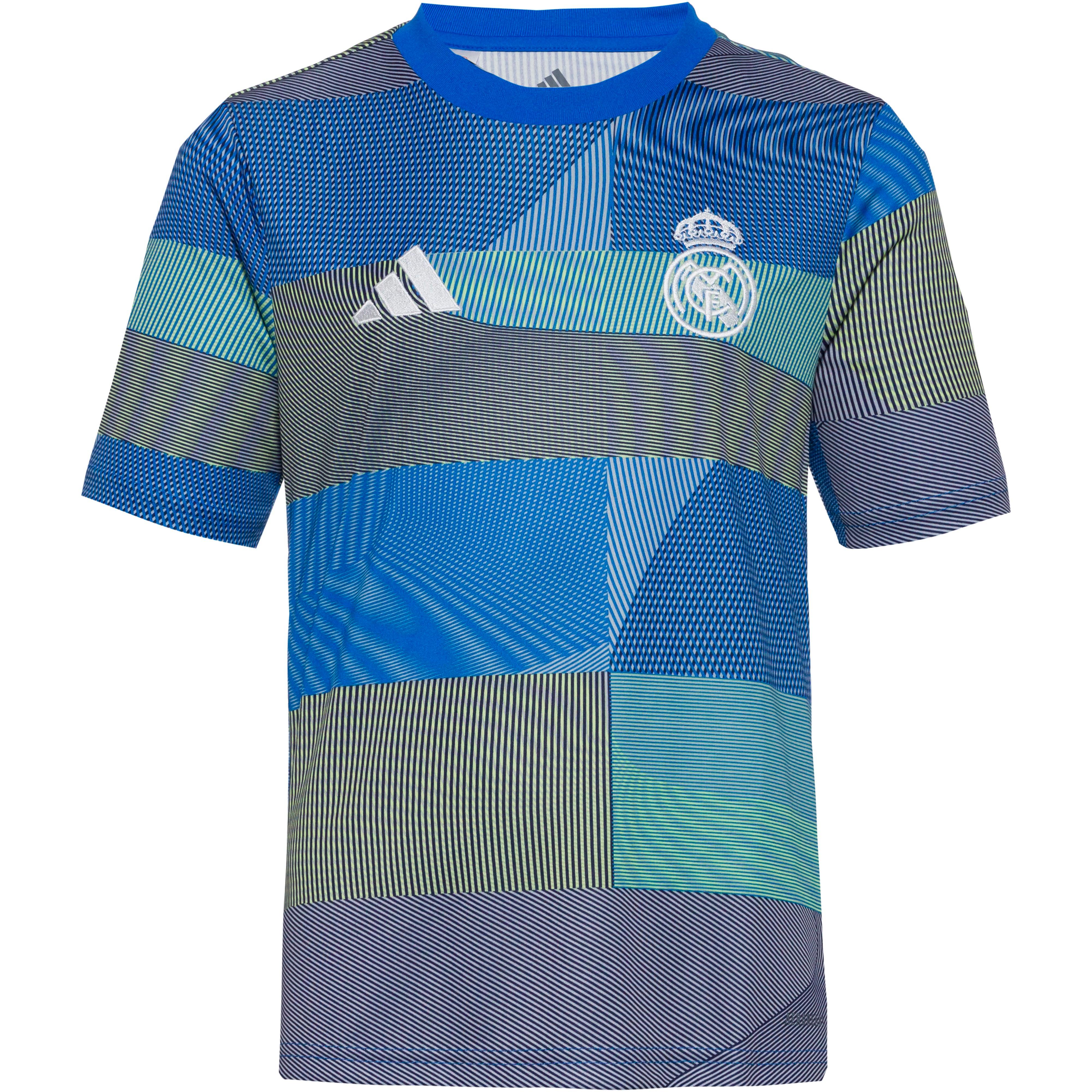 Prematch-Shirt für Kinder, des Real Madrids; mit feuchtigkeitsregulierender, atmungsaktiver und schnelltrocknender AERO.RDY-Technologie; Rundhalsausschnitt; Marken- und Vereinsdetails auf der Front; Material 100% Polyester (recycelt).