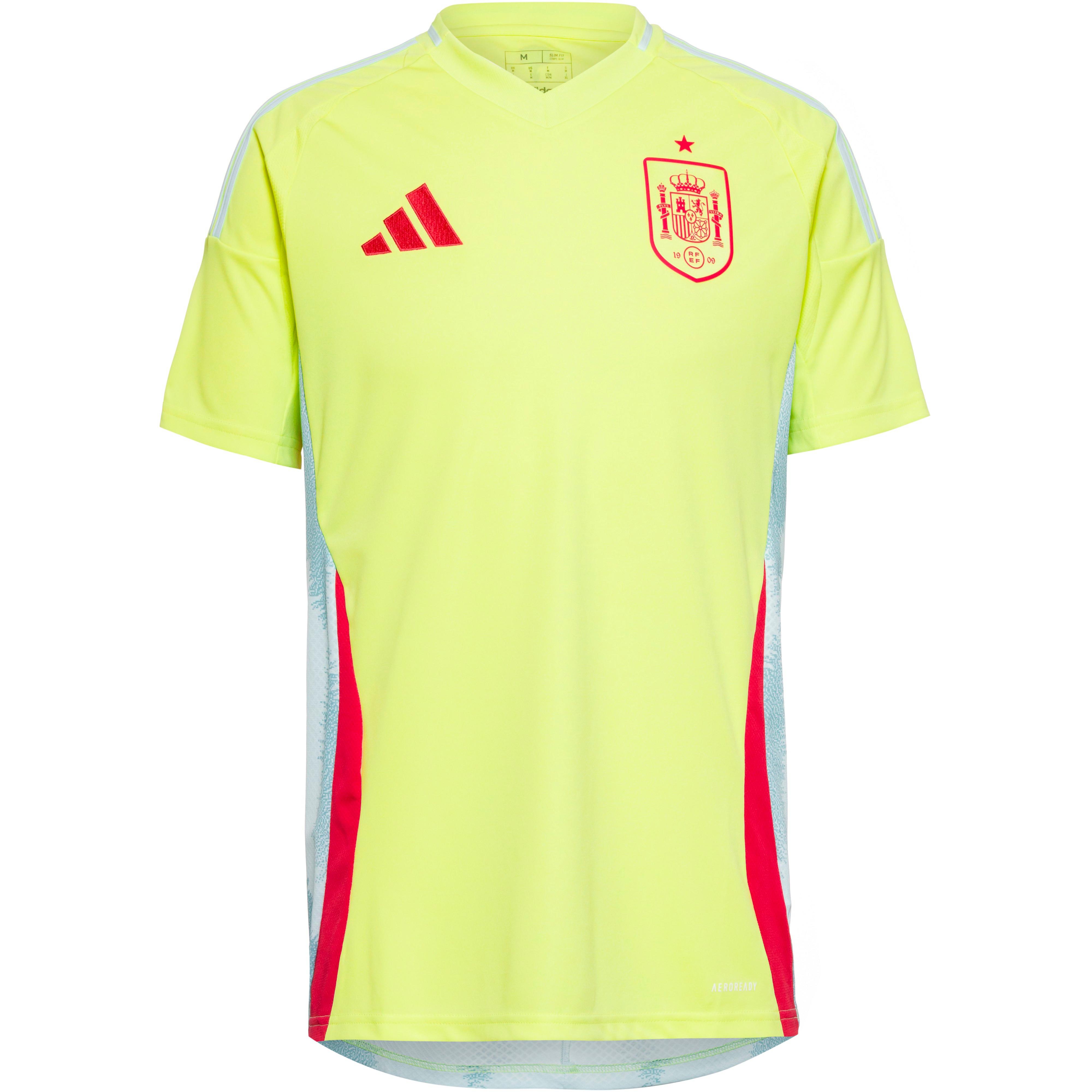 Auswärtstrikot der spanischen Nationalmannschaft; feuchtigkeitsableitend und schnelltrocknend dank AERO.RDY-Technologie; atmungsaktiv; strapazierfähig; gerippter V-Ausschnitt; Vereinswappen mit Meisterschaftsstern und Logostickerei auf der Vorderseite; 3-Streifen an den Schultern; Einsätze aus atmungsaktivem Mesh im Bereich der Achseln; normale Passform; aus Recyclingmaterial hergestellt; Material 100% Polyester (recycelt).