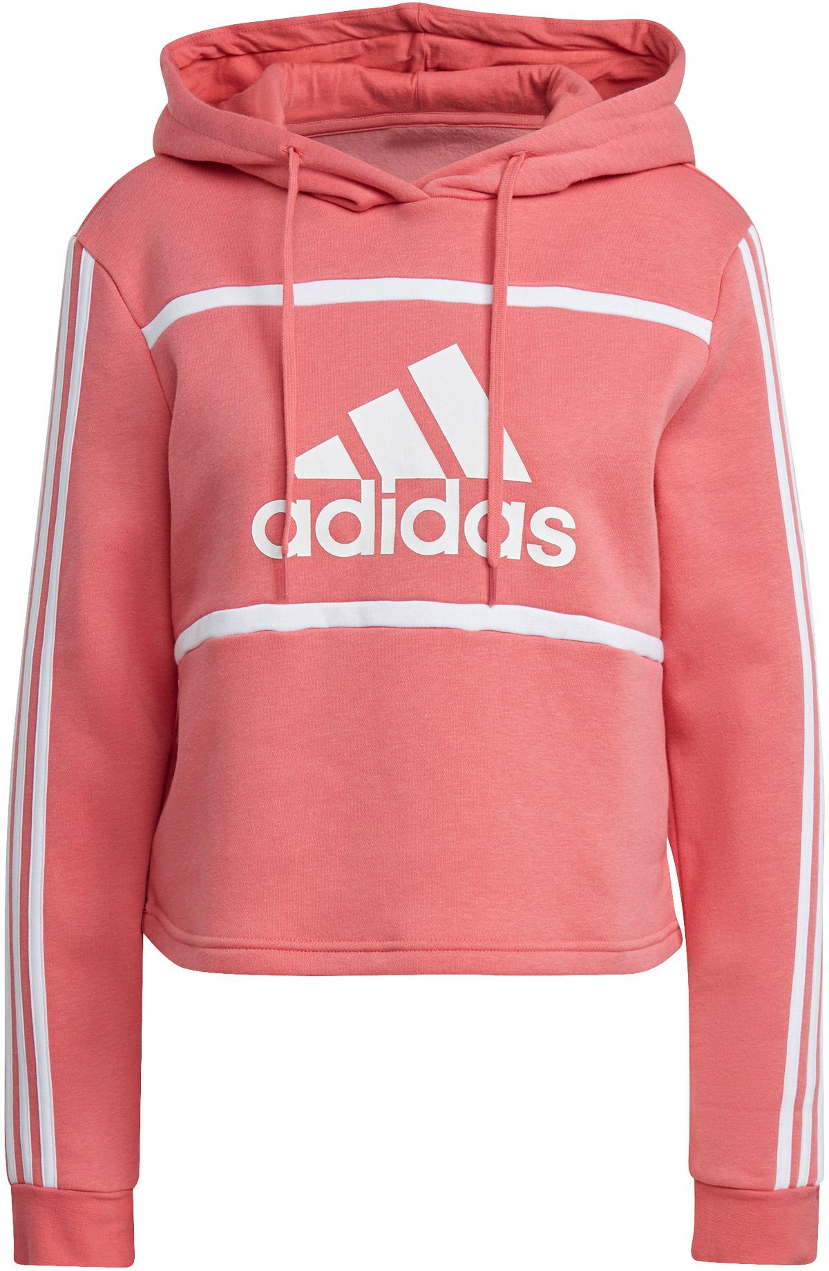 Hoodie im Cropped-Design; verstellbare Kapuze mit offener Naht und Kordelzug; breite Ärmelbündchen; großer Logo-Print auf der Vorderseite; 3-Streifen-Design auf den Ärmeln; Relaxed Fit; Material 53% Baumwolle, 36% Polyester, 11% Viskose.