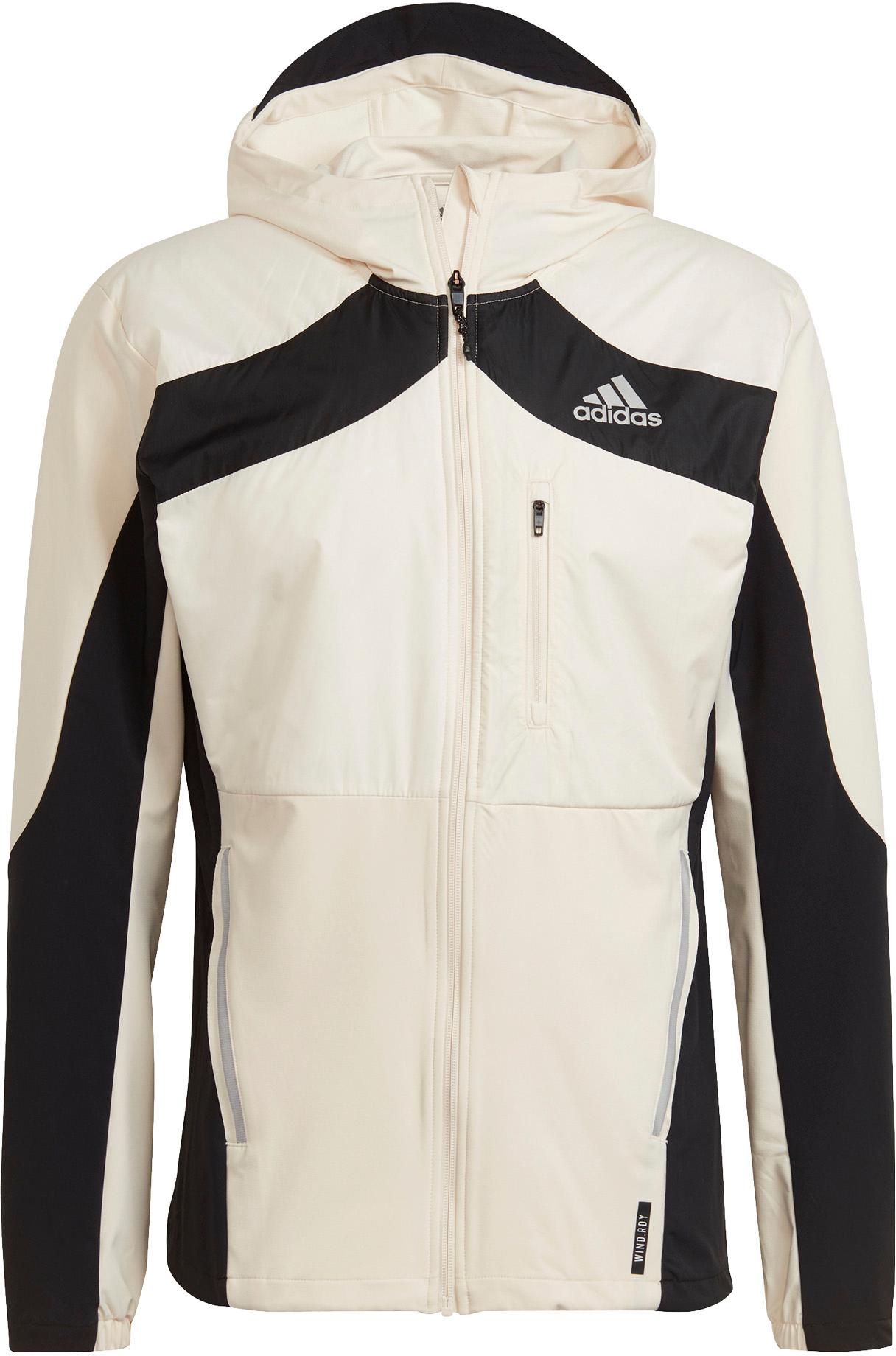Laufjacke mit wind- und wasserabweisender WIND.RDY-Technologie; feste Kapuze mit Schirm; Kinnschutz am Kragen; durchgehender Frontreißverschluss; 1 Brusttasche; 2 Reißverschlusstaschen; teilelastische Ärmelabschlüsse; Logo auf der Brust; reflektierende Details; Colourblock-Design; ohne PFC hergestellt; mit Primeblue-Material, welches zum Teil aus Parley Ocean Plastic® besteht, das aus recyceltem Plastikmüll hergestellt wird; Material 88% Polyester (recycelt); 12% Elastan.