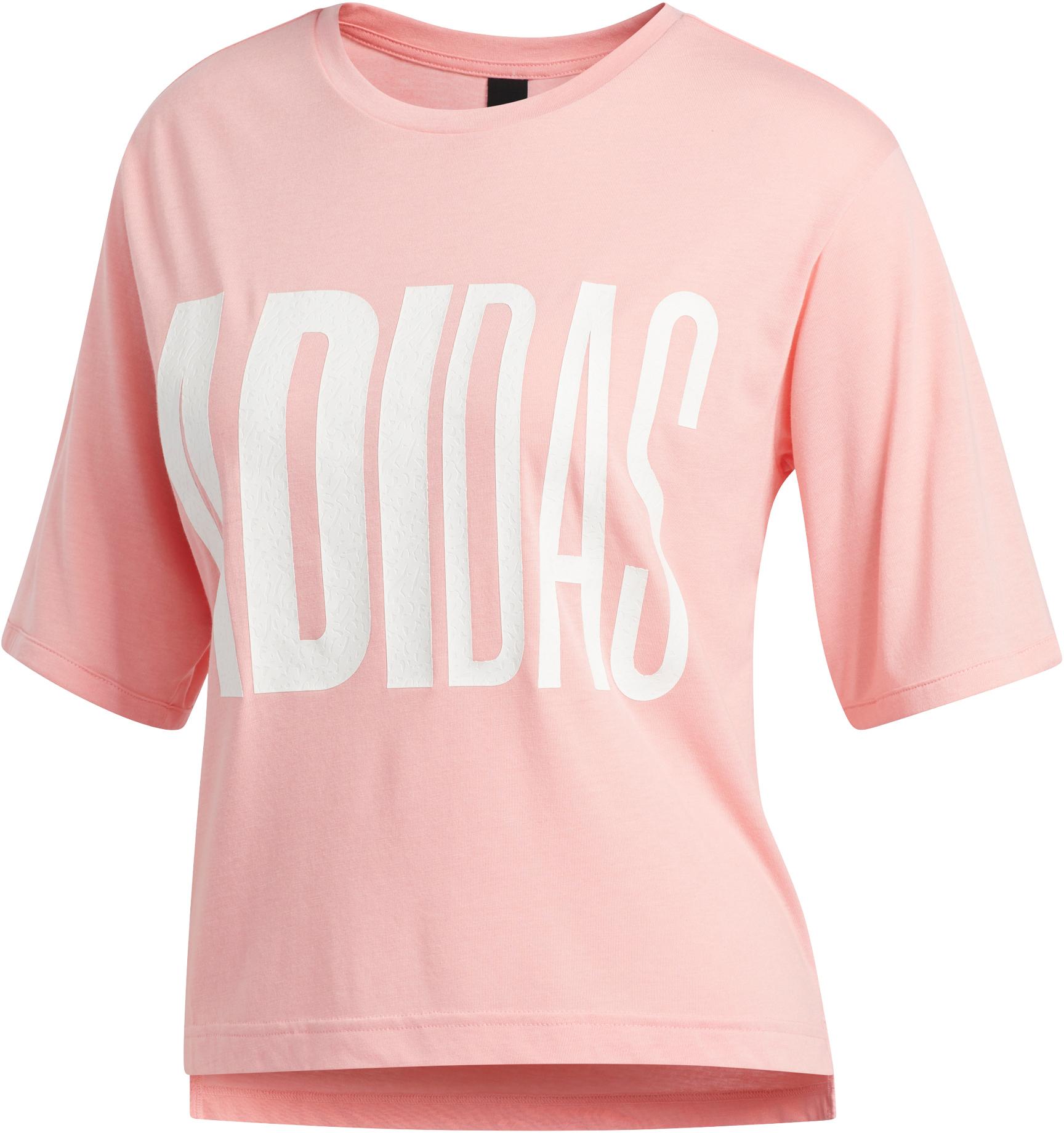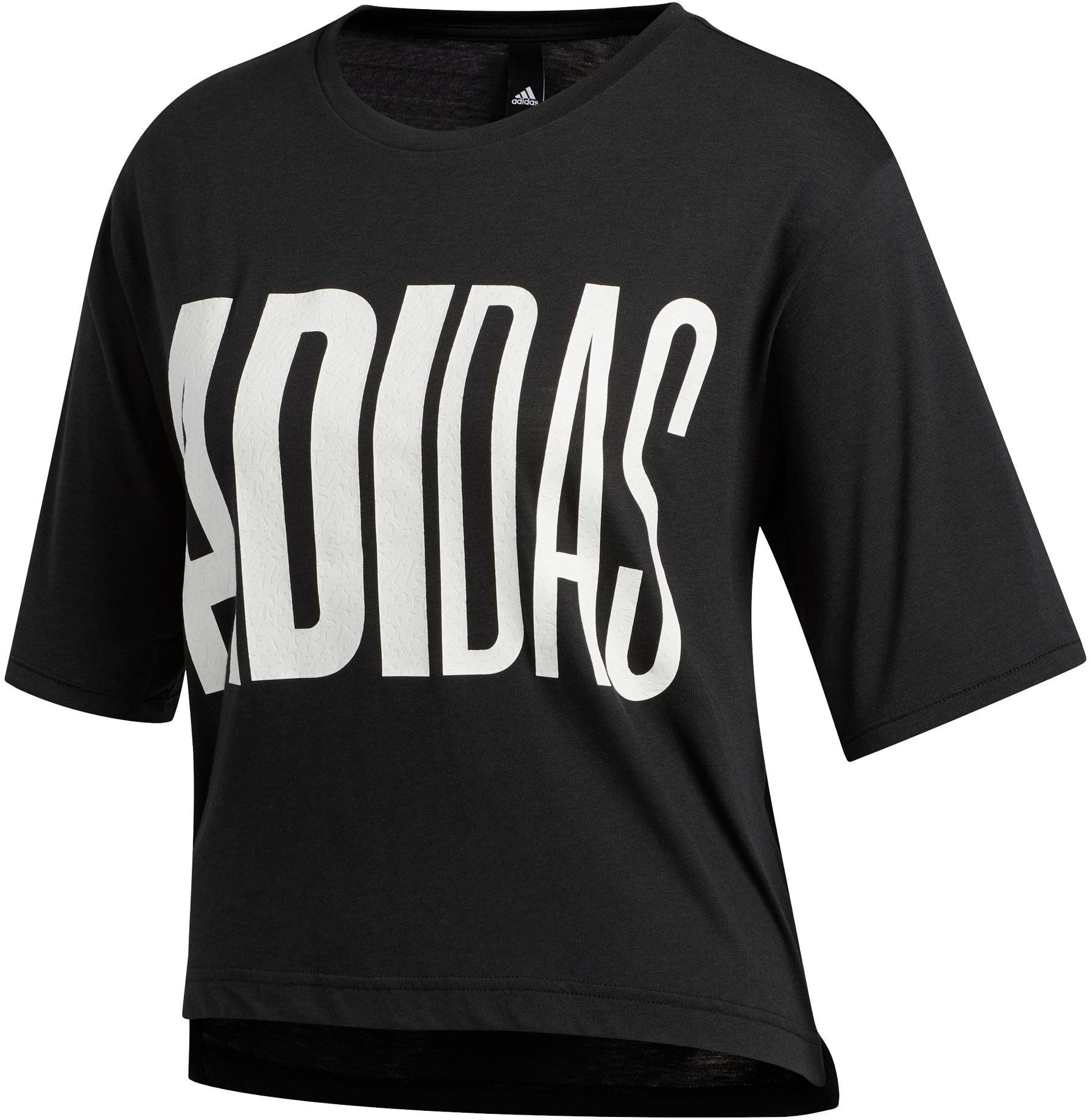 adidas Leicht gecropptes T-Shirt aus weichem Baumwollmischgewebe mit geripptem Rundhalsausschnitt und Nackenband; mittellange Ärmel; Schlitze in der Saumaußenseite; verlängerter Rückenbereich; Frontprint; Logo-Detail; Material 50% Polyester, 25% Baumwolle, 25% Viskose.
