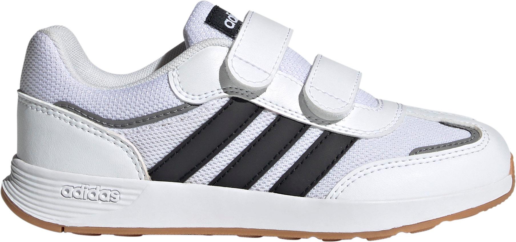 Hallenschuhe für Kinder; Obermaterial aus Mesh und weichem Synthetikleder mit seitlichen 3-Streifen; 2 Klettverschlüsse; Textilfutter; leicht dämpfende Zwischensohle; Gummi-Außensohle.