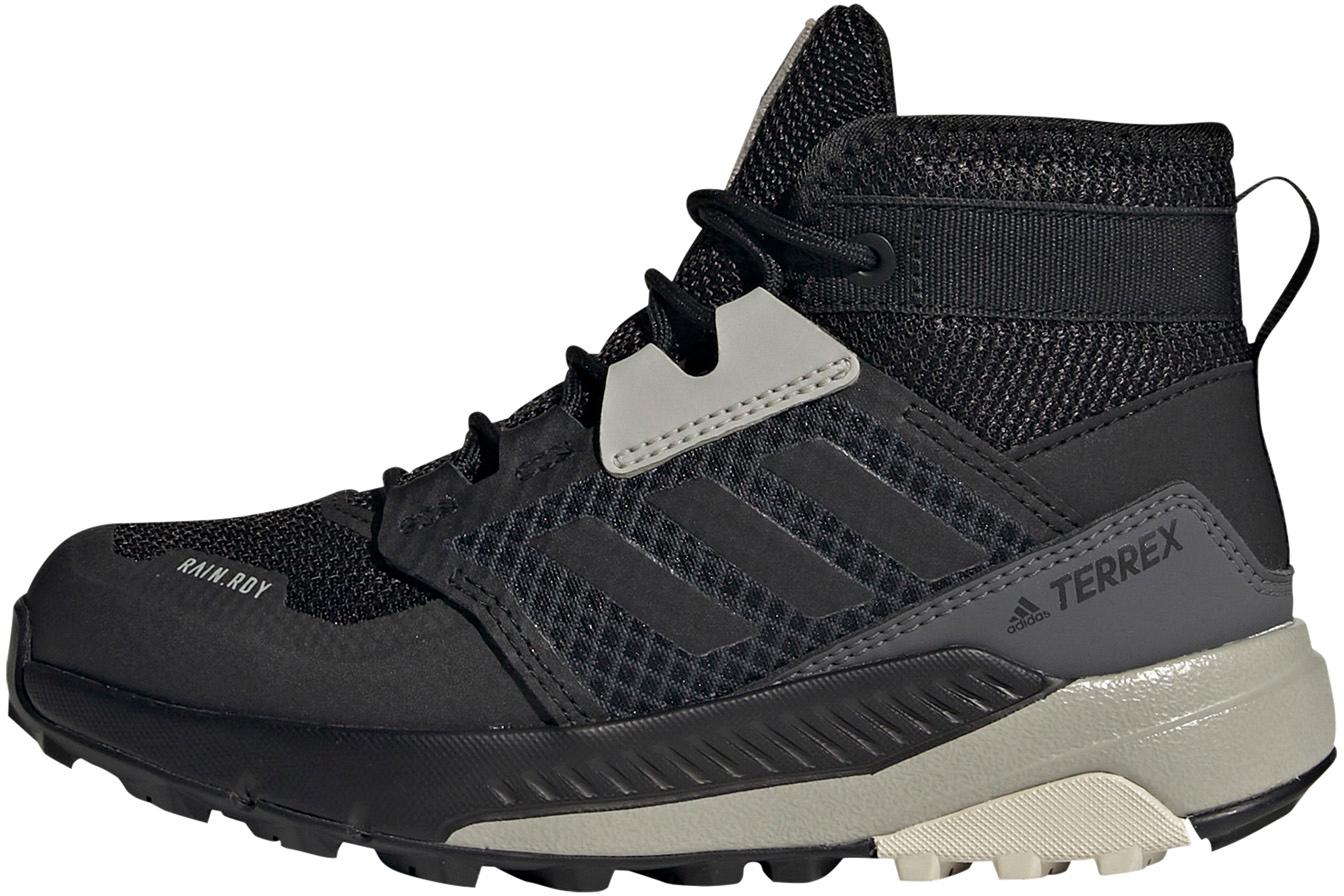Robuste Wanderschuhe aus der Terrex-Serie im halbhohen Running-Style; strapazierfähiges Textil-Obermaterial; klassische Schnürung, weich gepolsterter Schaft mit Zuglasche; Textilfutter; EVA-Zwischensohle; Schmutzfang aus TPU; stark profilierte Traxion® Außensohle für optimalen Halt und Traktion auf rutschigem Fels und Matsch; mit und wind- und wasserdichter RAIN.RDY-Technologie; 3-Streifen-Design; reguläre Passform