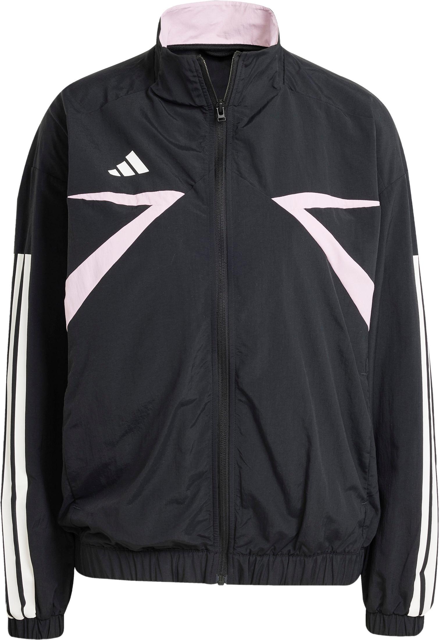 Locker geschnittene Trainingsjacke mit Stehkragen und durchgehendem Reißverschluss; grafische Prints und Logoprint; 3-Streifen-Design an den Ärmeln; 2 Seitentaschen; Material 100% Polyamid (recycelt).