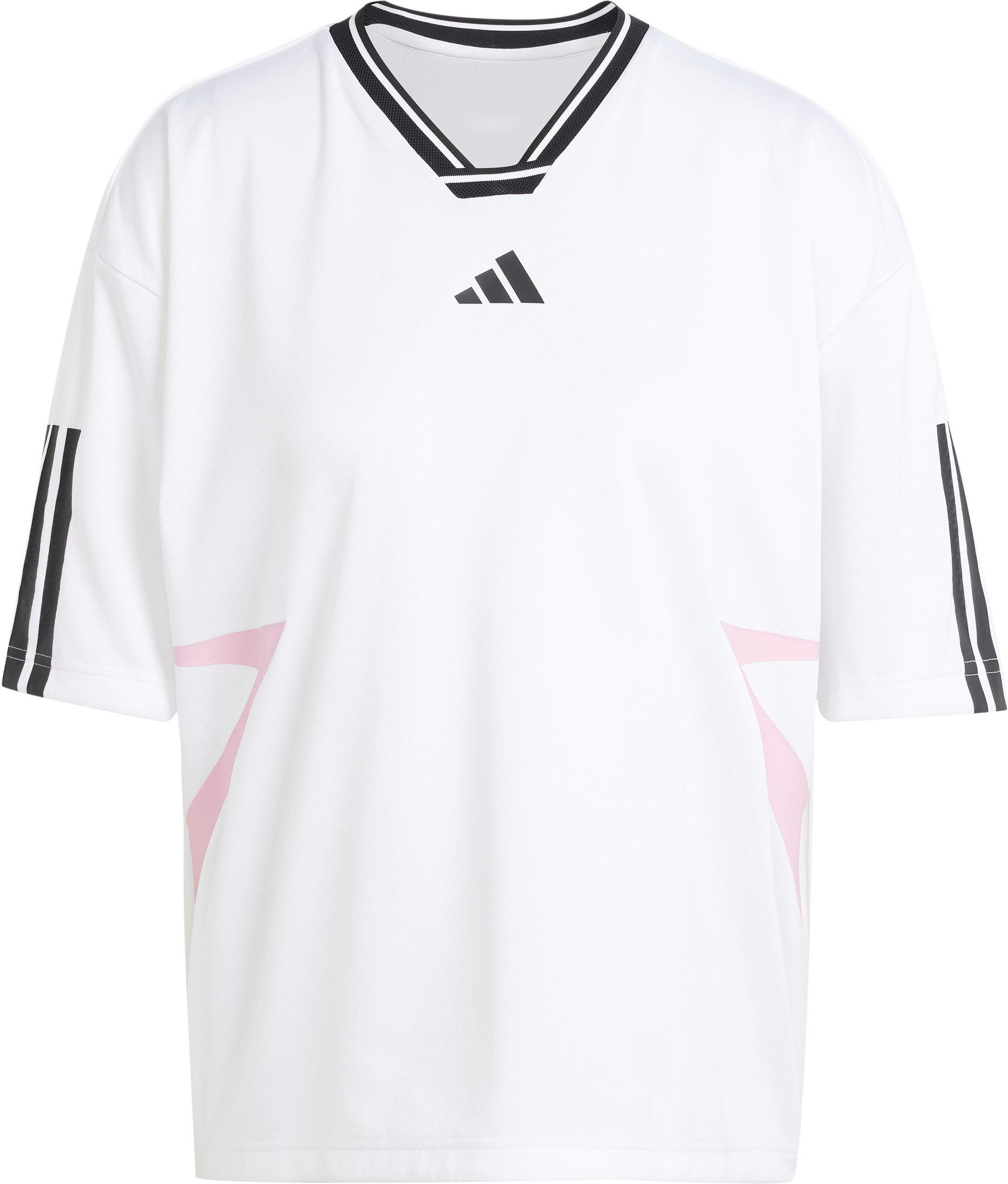Lässiges T-Shirt mit V-Ausschnitt und überschnittenem Schulterbereich; Logoprint auf der Vorderseite; 3-Streifen-Design auf den Ärmeln; grafische Printdetails; Material 100% Polyester (recycelt).