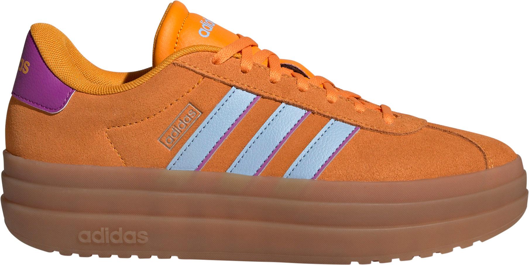 Sneaker mit erhöhter Plateausohle; Obermaterial aus weichem Leder mit seitlichen 3-Streifen; flache Schnürsenkel; gepolsterter Kragen; Textilfutter; strapazierfähige Gummi-Außensohle mit griffigem Profil; normale Schuhweite.