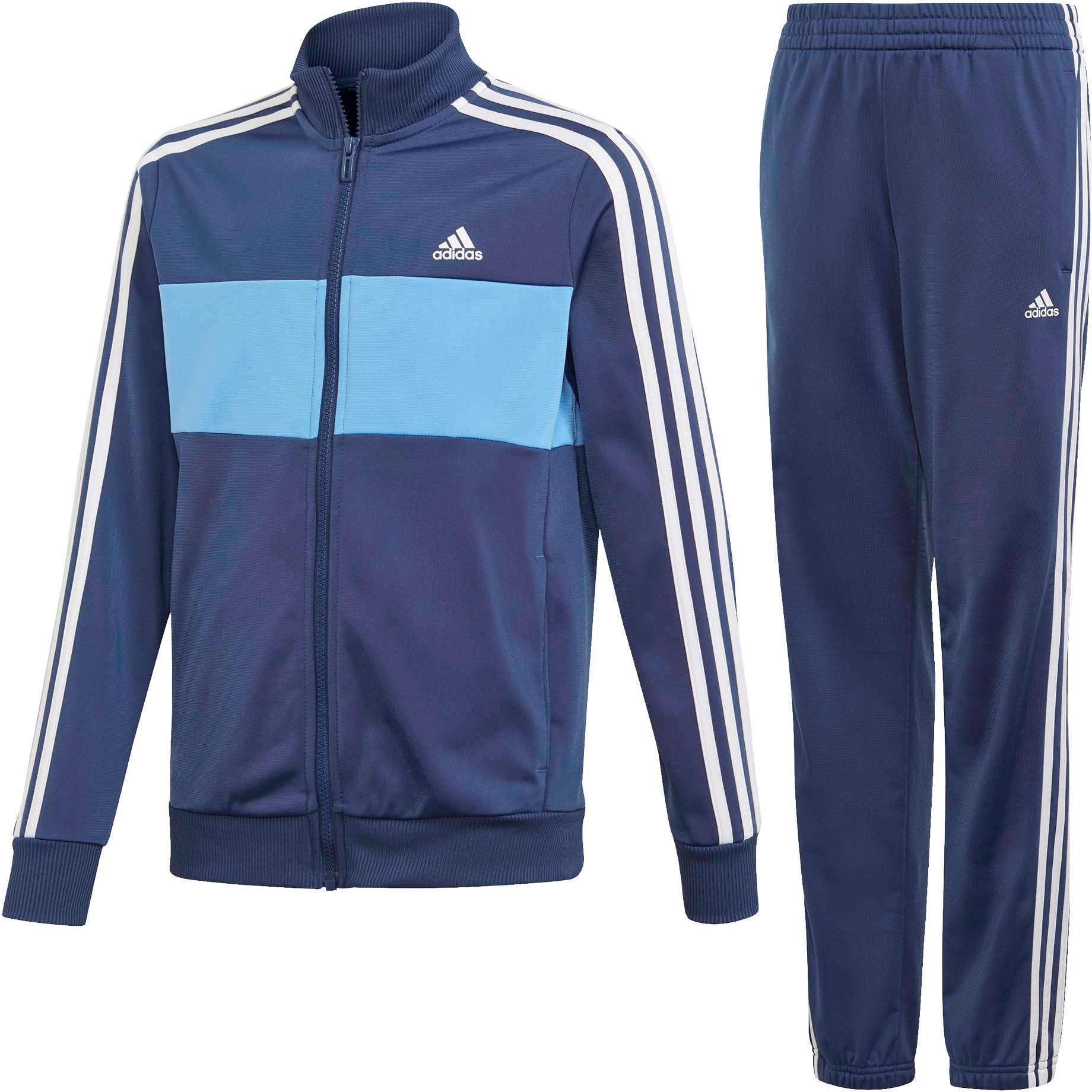 adidas YB TS TIBERIO. Trainingsanzug im sportivem Design; Jacke mit Stehkragen; durchgehender Frontreißverschluss; 2 Taschen; Abschlüsse mit Rippbündchen; Hose in schmal zulaufender Passform; Bund und Beinabschlüsse elastisch; 3-Streifen-Design an den Ärmeln und Beinseiten; Material 100% Polyester (recycelt).