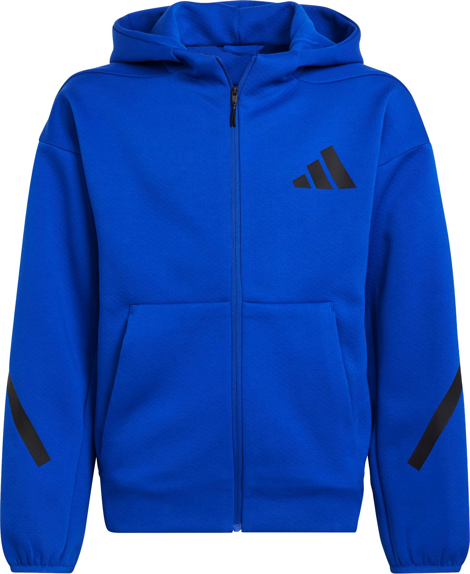 Sweatjacke aus 3-lagigem, kälteabweisendem Gewebe für Kinder; Kapuze; hochabschließender Reißverschluss; 3 Bar-Logo auf Brusthöhe; Logodetails an den Ärmeln; 2 Reißverschlusstaschen; elastische Abschlüsse; mit Recyclingmaterial hergestellt; Material 57% Polyester (recycelt), 43% Baumwolle.